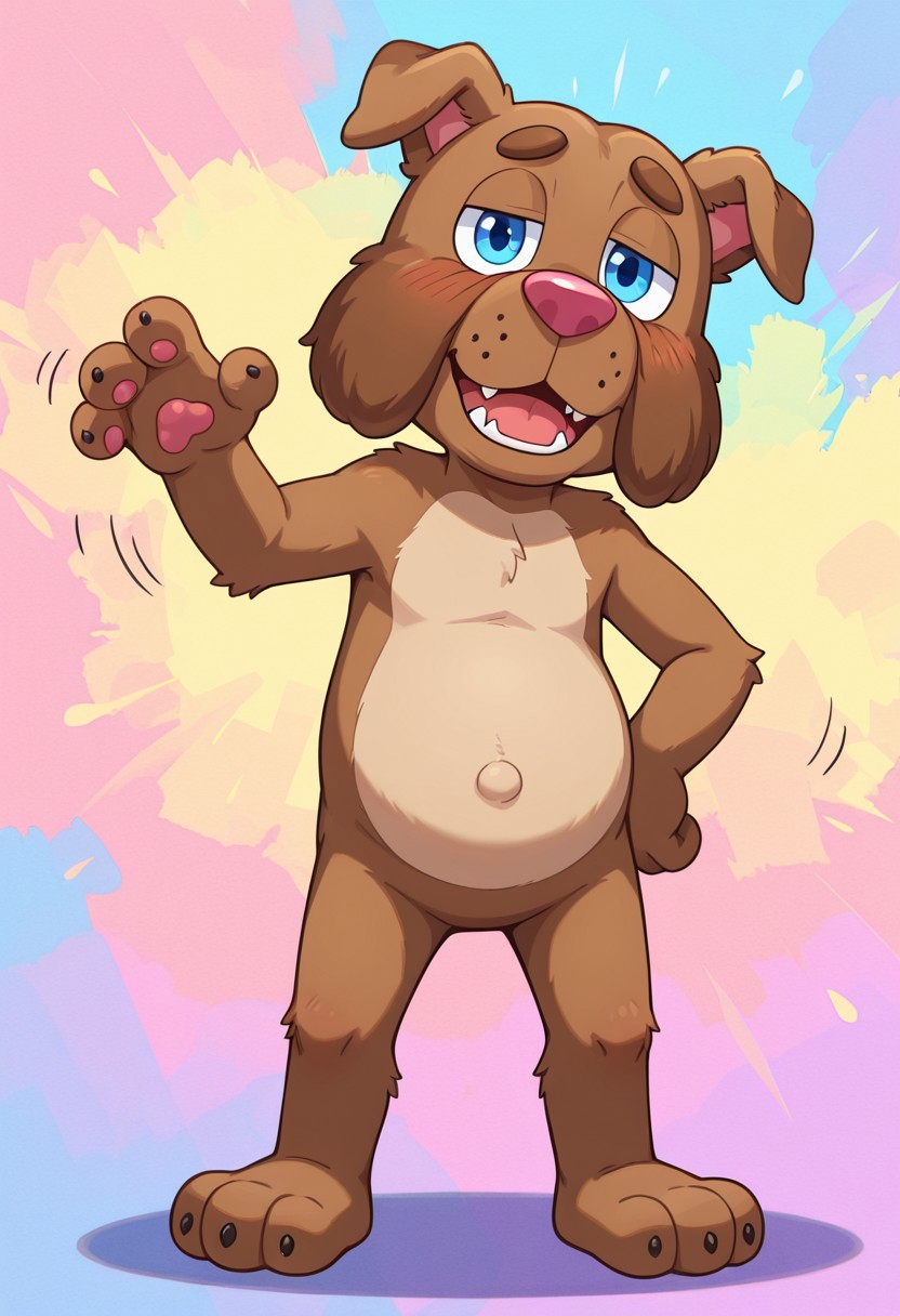 buff, dog, 1boy, blue eyes, (fangs), cartoon dog, brown fur, beige belly, pink nose, big blue eyes, floppy ears, high quality