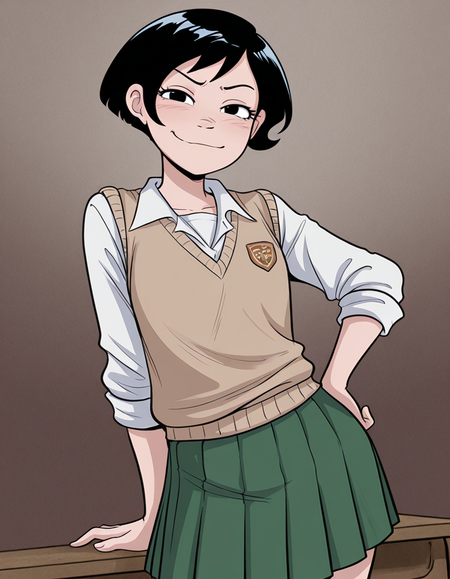 • short hair, black hair, black eyes, school uniform, white undershirt, brown vest, green pleated skirt