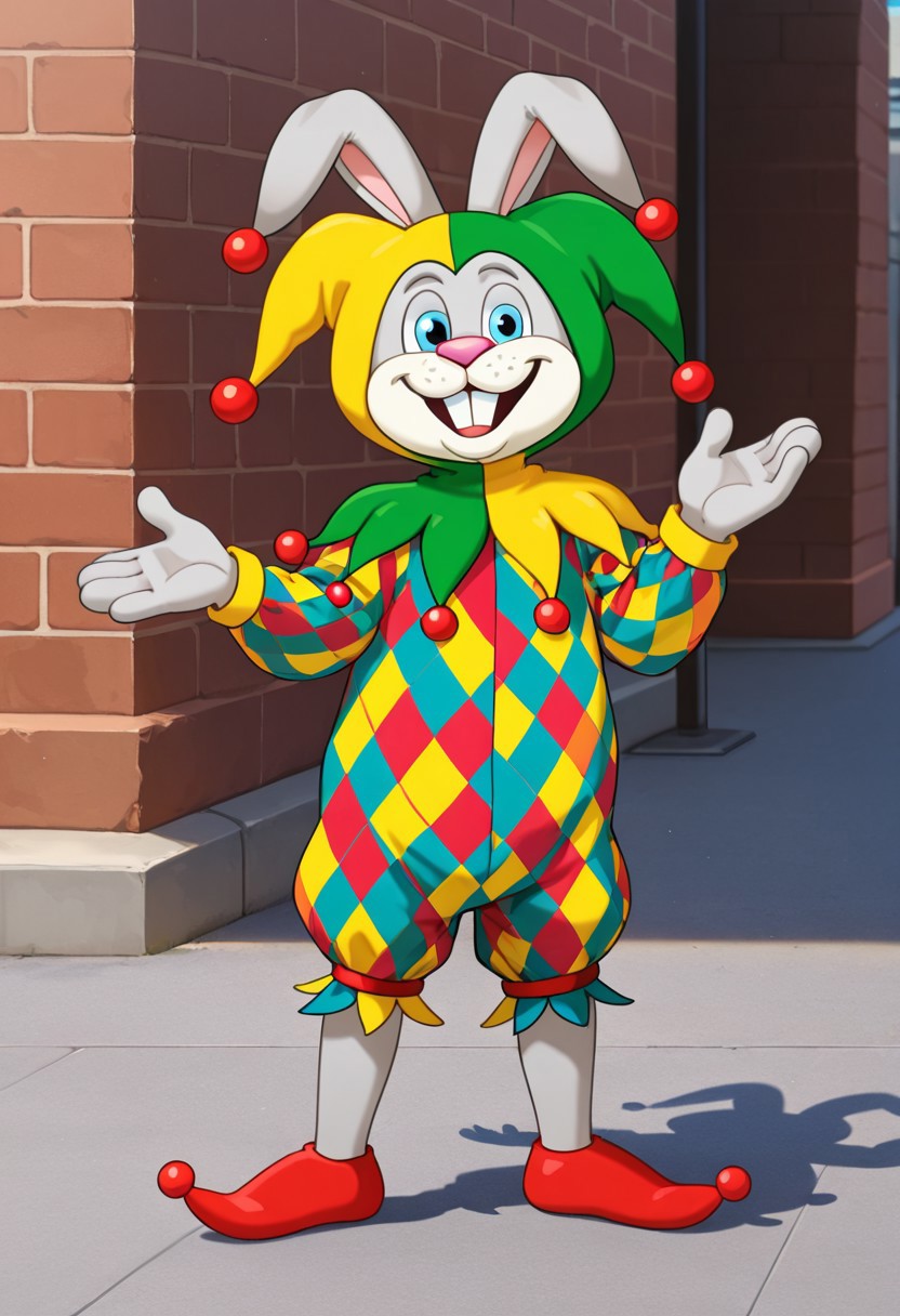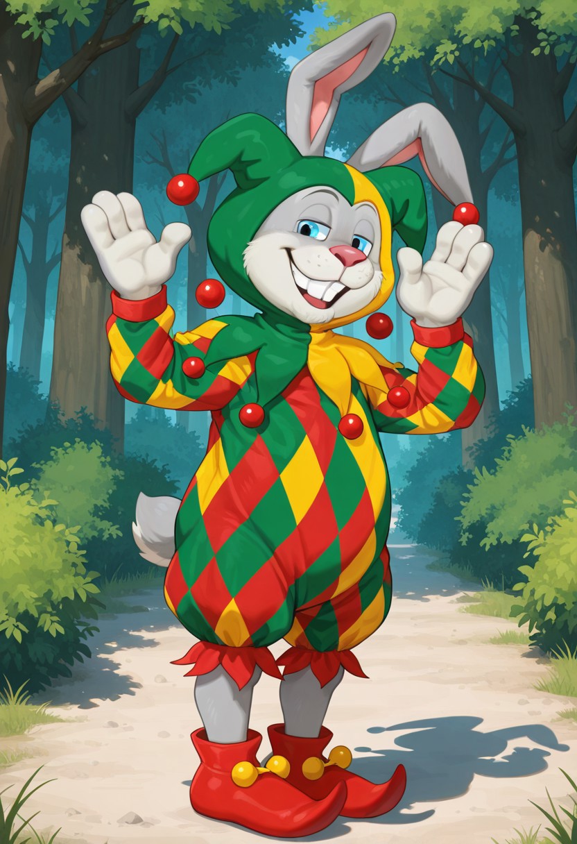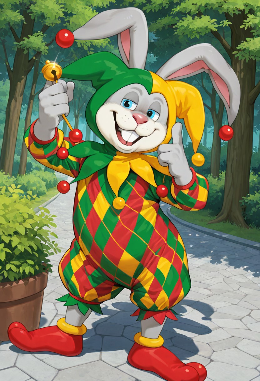 terteluk, hare, 1boy, blue eyes, hare, smug face, solo, 1boy, terteluk, cartoon hare, jester costume, colorful checkered outfit, green and yellow jester hat with bells, red shoes, big white teeth, pink nose, long hare ears with bells, standing on two legs, high quality