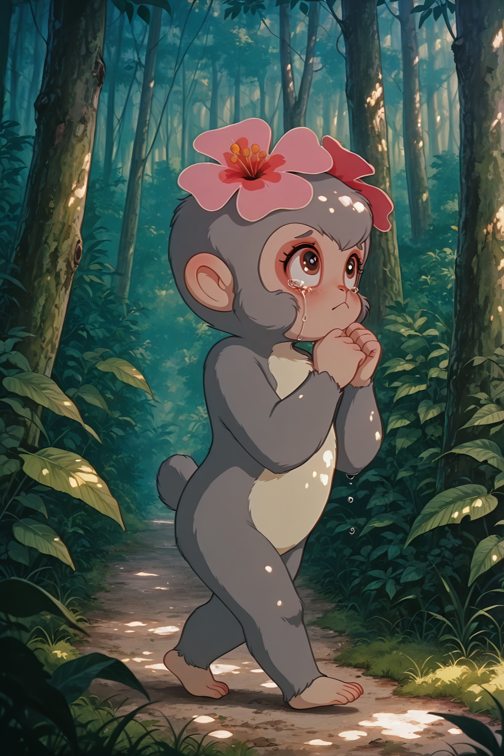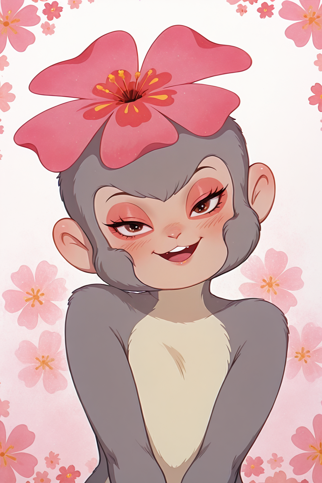 1girl, monkey, grey fur, brown eyes, single hair flower, no clothes, no humans
