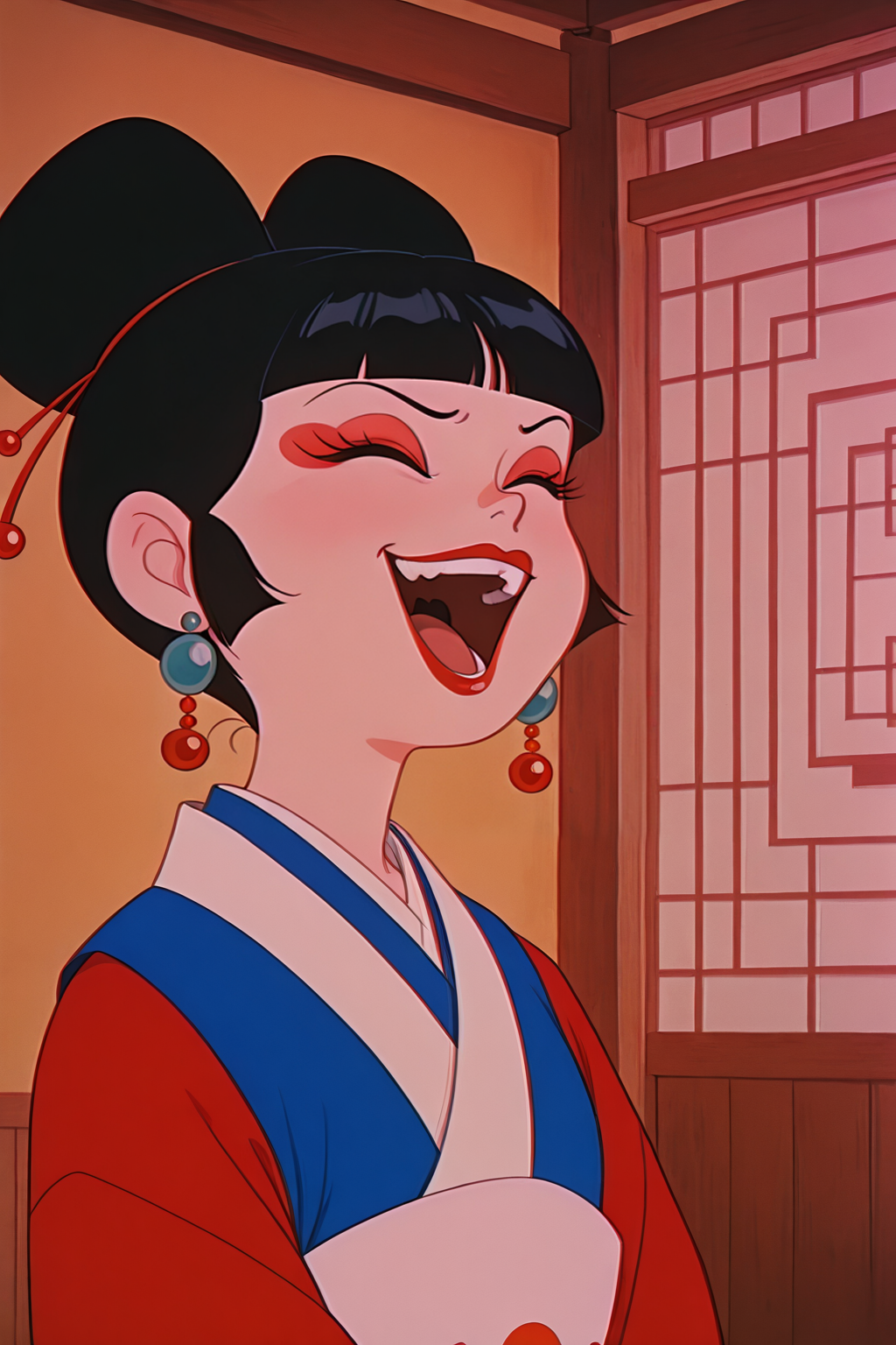 1girl, black hair, hair ring, makeup, black eyes, red lips, lipstick, earrings, jewelry, blunt bangs,japanese clothes, kimono, laughing