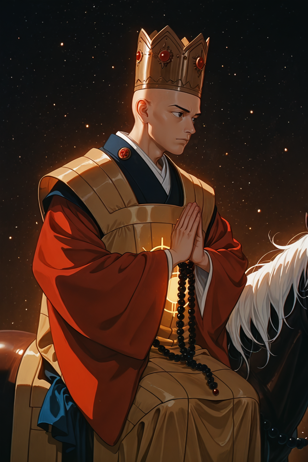monk, 1boy, prayer beads, praying, black eyes, crown, kesa, jewelry, wide sleeves, long sleeves, japanese clothes