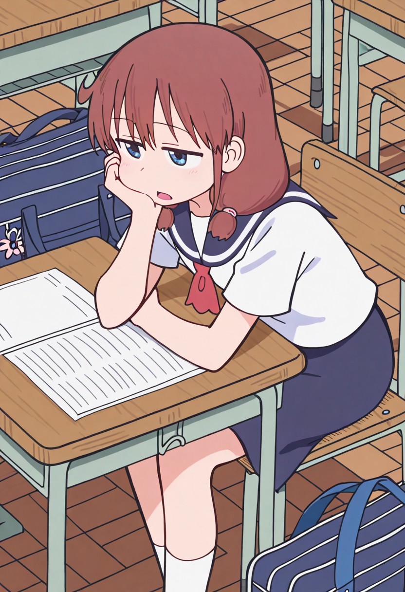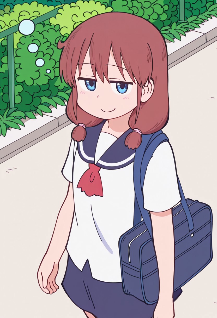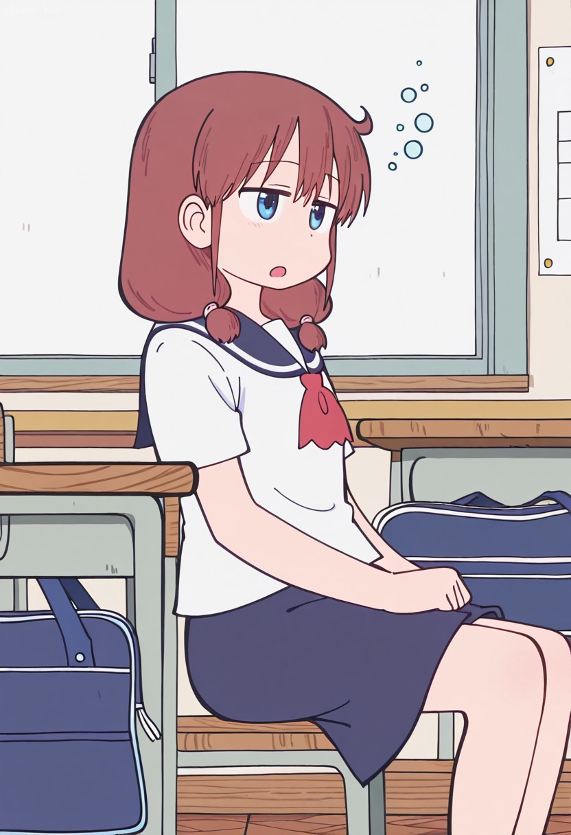 trigger words : anime coloring, 1girl, izumi riko, brown reddish hair, twintails, blue eyes, jitome