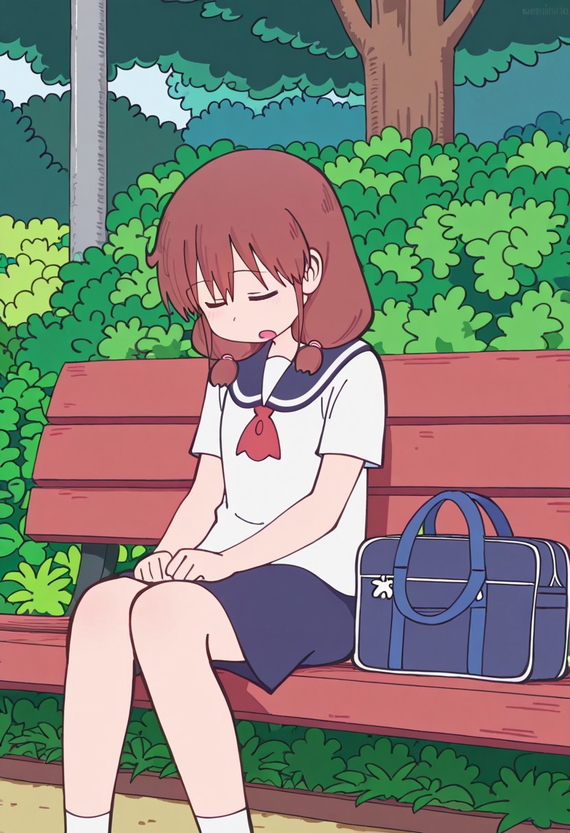 clothing : serafuku, white shirt, red tie, sailor collar, navy blue collar, navy blue skirt, dark blue school bag