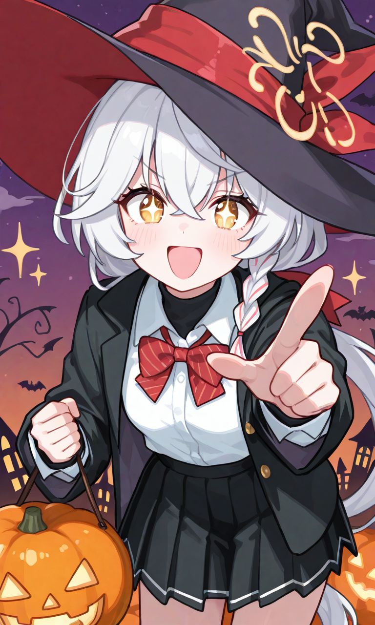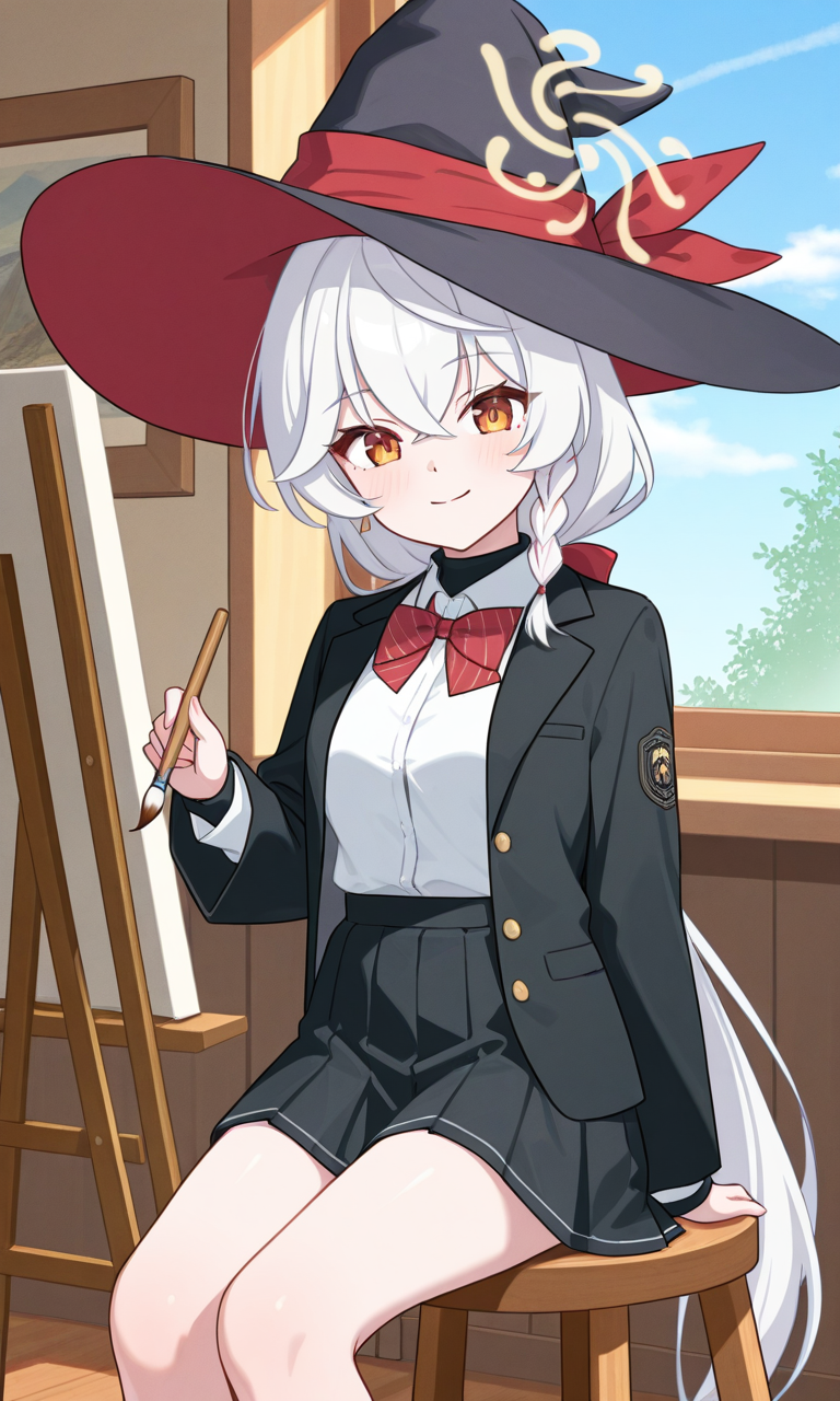 shirao eri, very long hair, low ponytail, single braid, witch hat, halo, white shirt, collared shirt, red bowtie, black jacket, open jacket, black skirt, pleated skirt