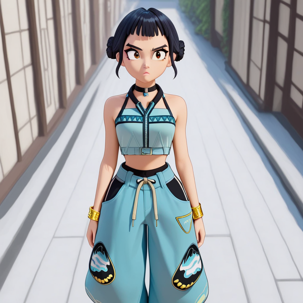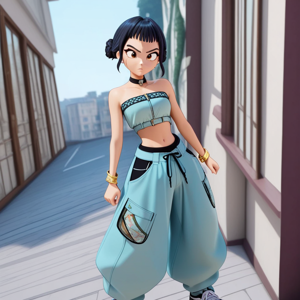 short hair, black hair, hair bun, double bun, bangs, brown eyes, bare shoulders, jewelry, bracelet, midriff, light blue crop top, choker, pants, baggy pants, sneakers