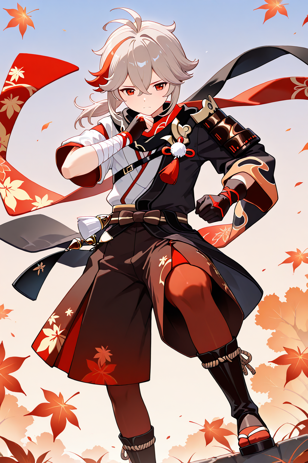 kazuha, streaked hair, multicolored hair, antenna hair, ponytail, grey hair, red hair, japanese_clothes, hakama_shorts, scarf, leaf_print, japanese armor, tassel, red pantyhose, gloves, bandaged_arm, asymmetrical_sleeves,