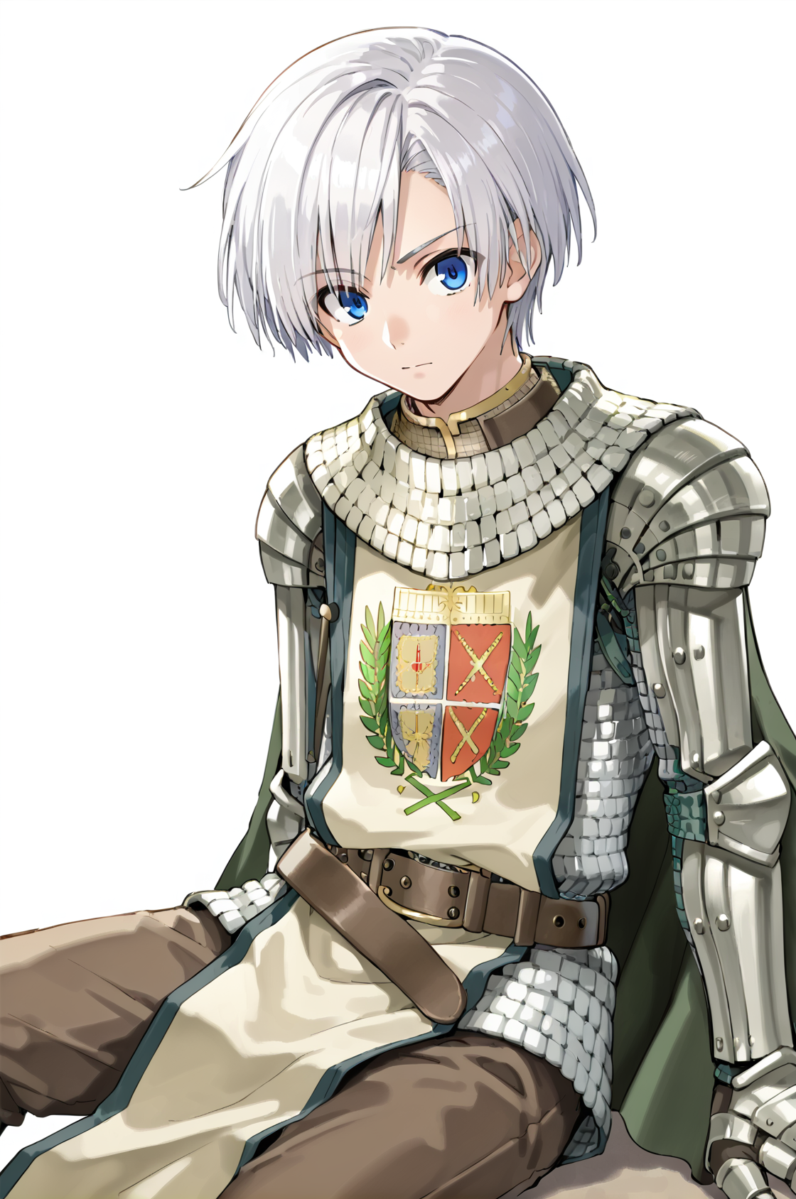 prompt: knightROMale, cape, silver gauntlets, brown collar, silver pauldrons, silver shoulder armor, chainmail, emblem, belt, full silver armor, tabard, pelvic curtain, brown pants, silver greaves,