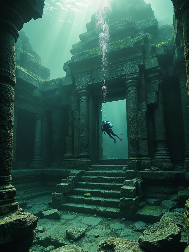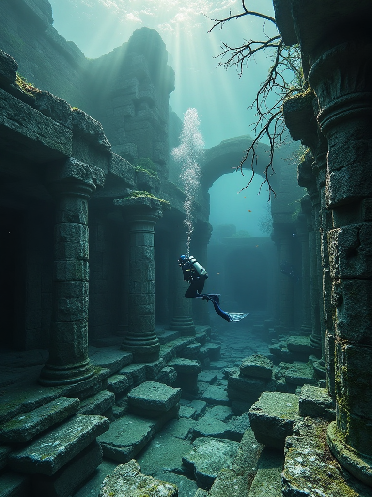 Underwater ruins and divers, submerged temples, delicate light, divers swim gently, as if time has stopped in these ancient remains.