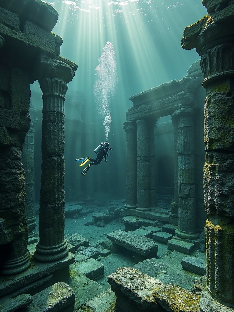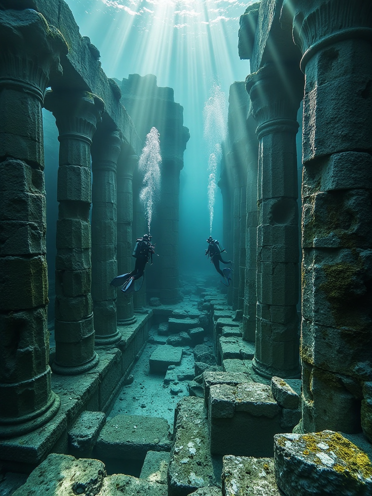 Underwater ruins and divers, light filters through water, crumbling temples stand, divers swim near fallen columns, a sense of lost history.