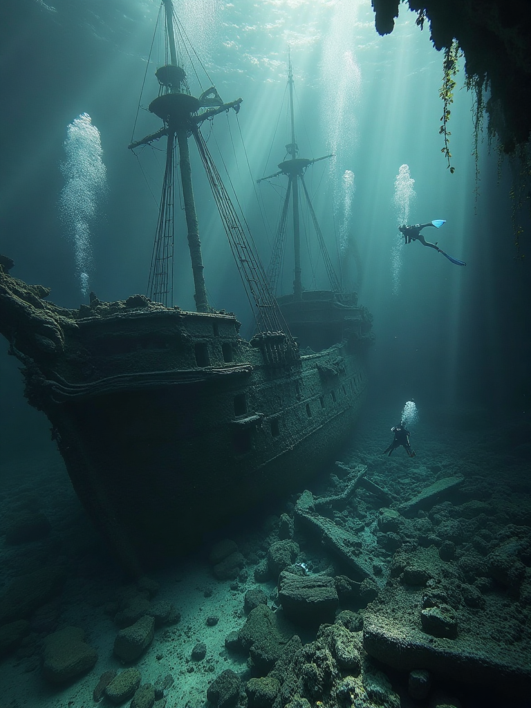 Underwater ruins and divers, a shipwreck amidst ruins, beams create dramatic shadows, divers discover secrets, the ocean’s hidden past unfolds.