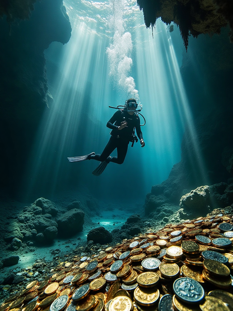 Underwater ruins and divers, sunbeams pierce blue, ancient stone structures covered in algae, gold coins glinting, silent exploration in mysterious depths.