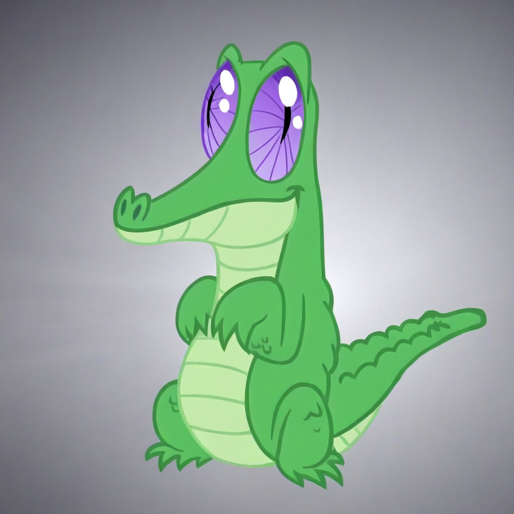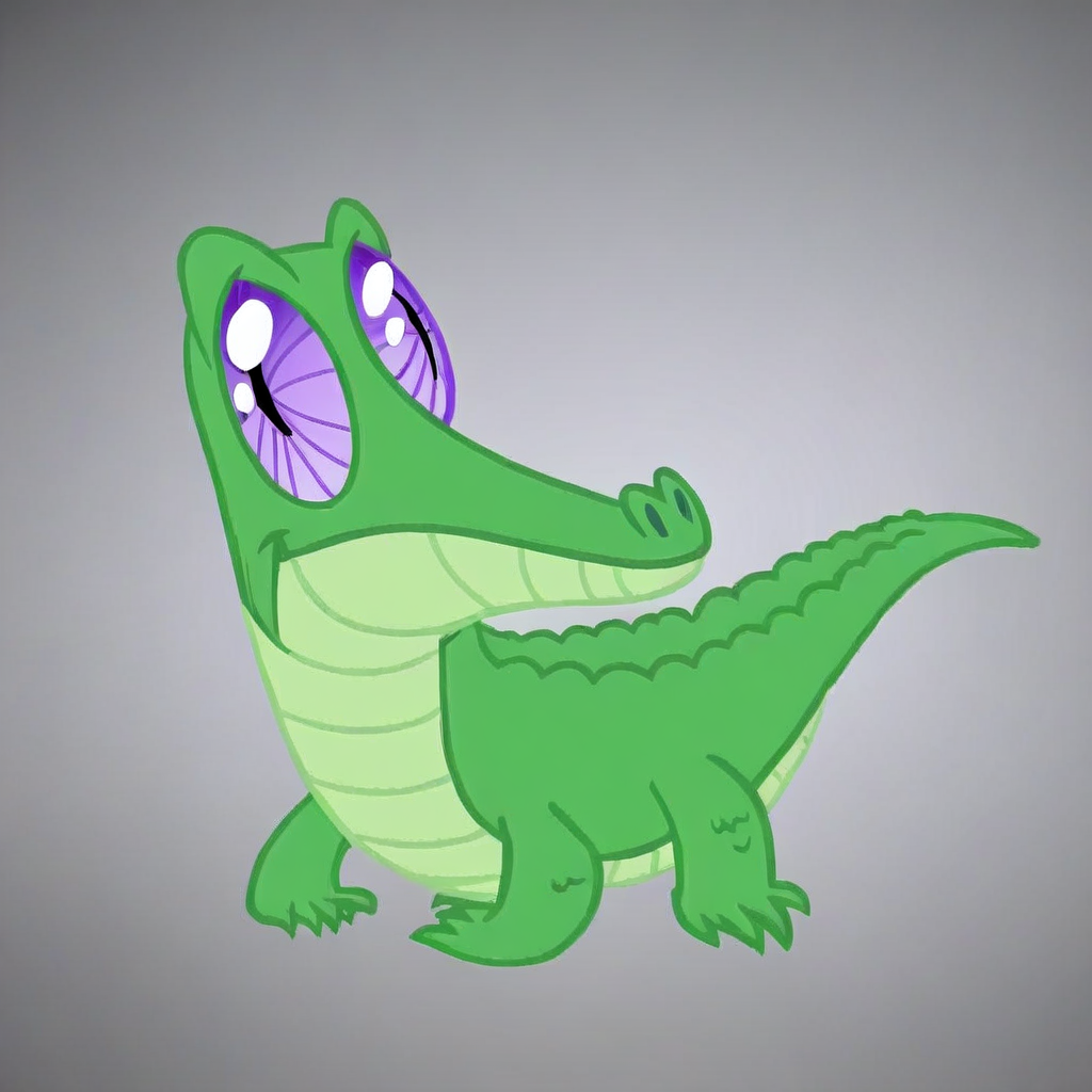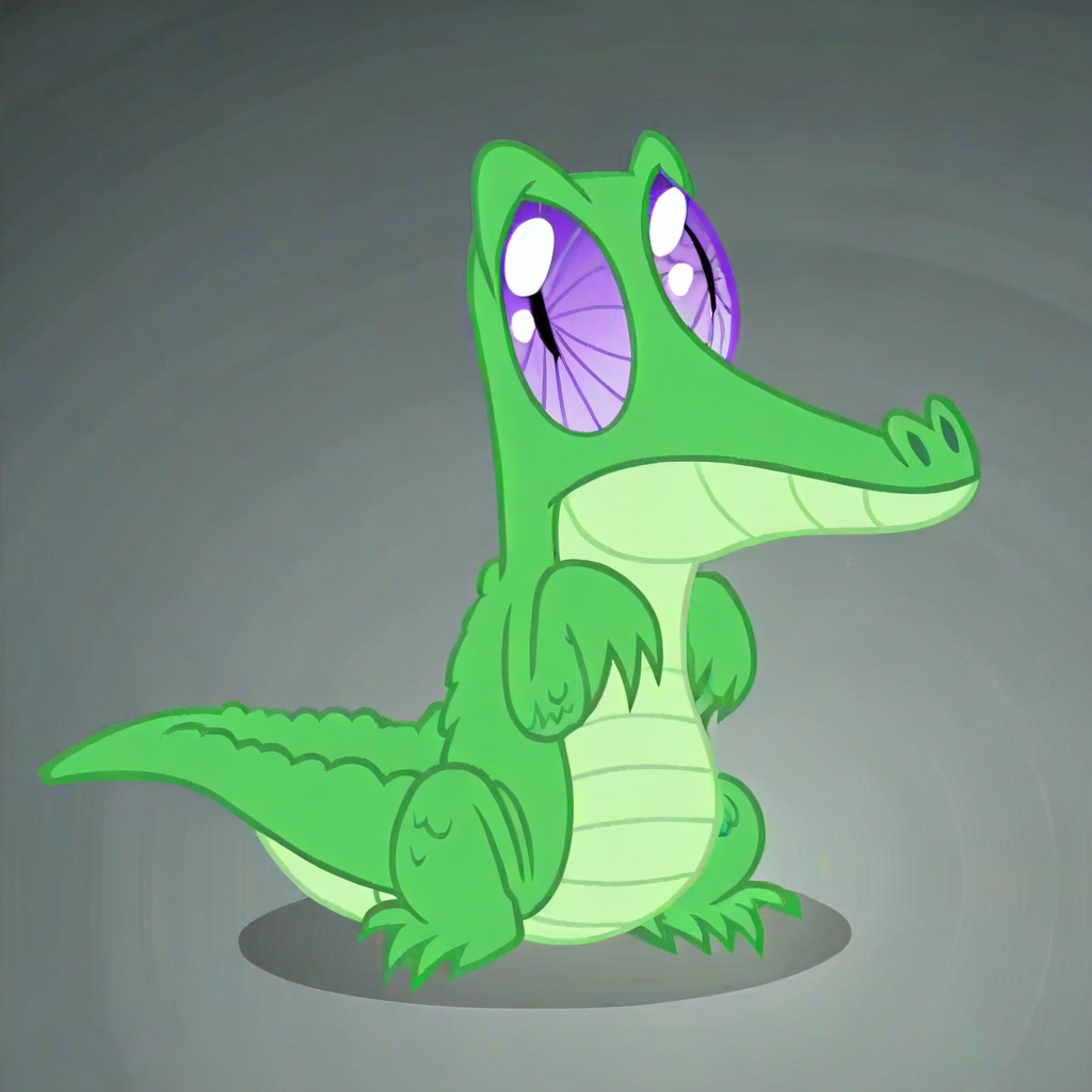 <lora: MLP: FIM - Gummy:1>, Gummy,solo,anthro alligator,feral alligator, small reptile, bright green scales, light green underbelly, short rounded snout, large purple spiral eyes, short tail, stubby legs, no teeth, smooth body.