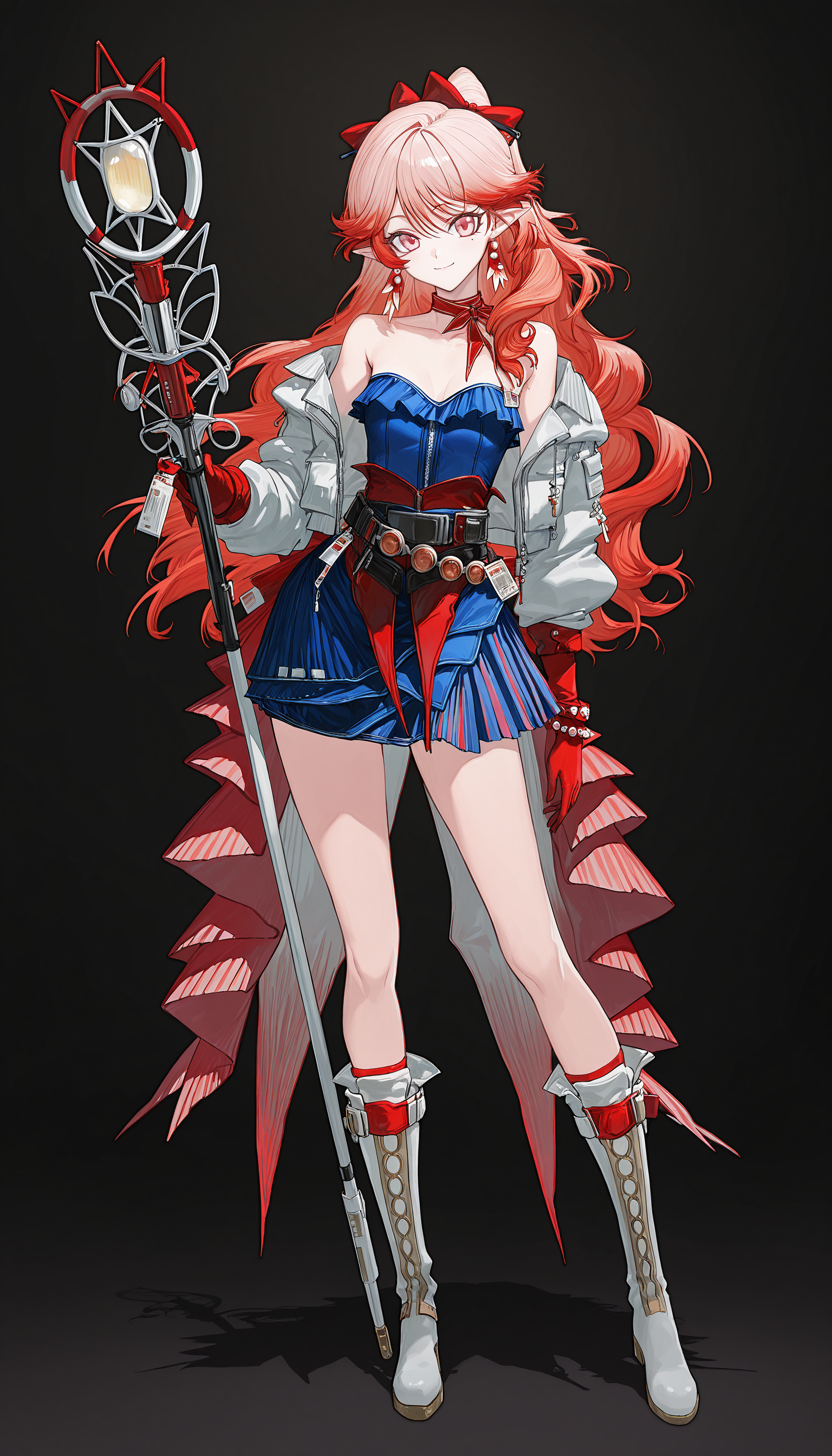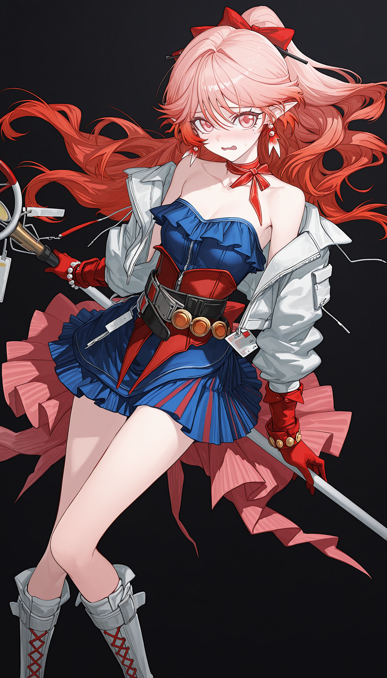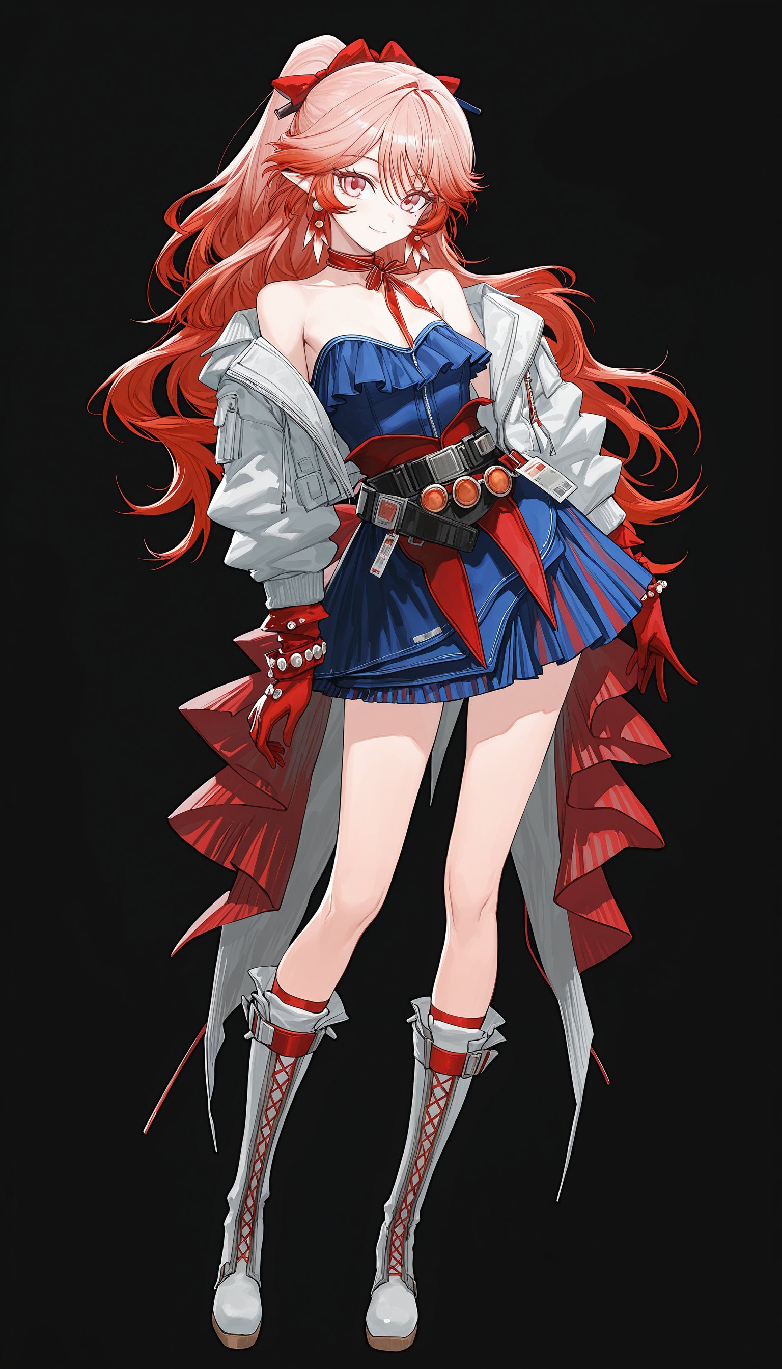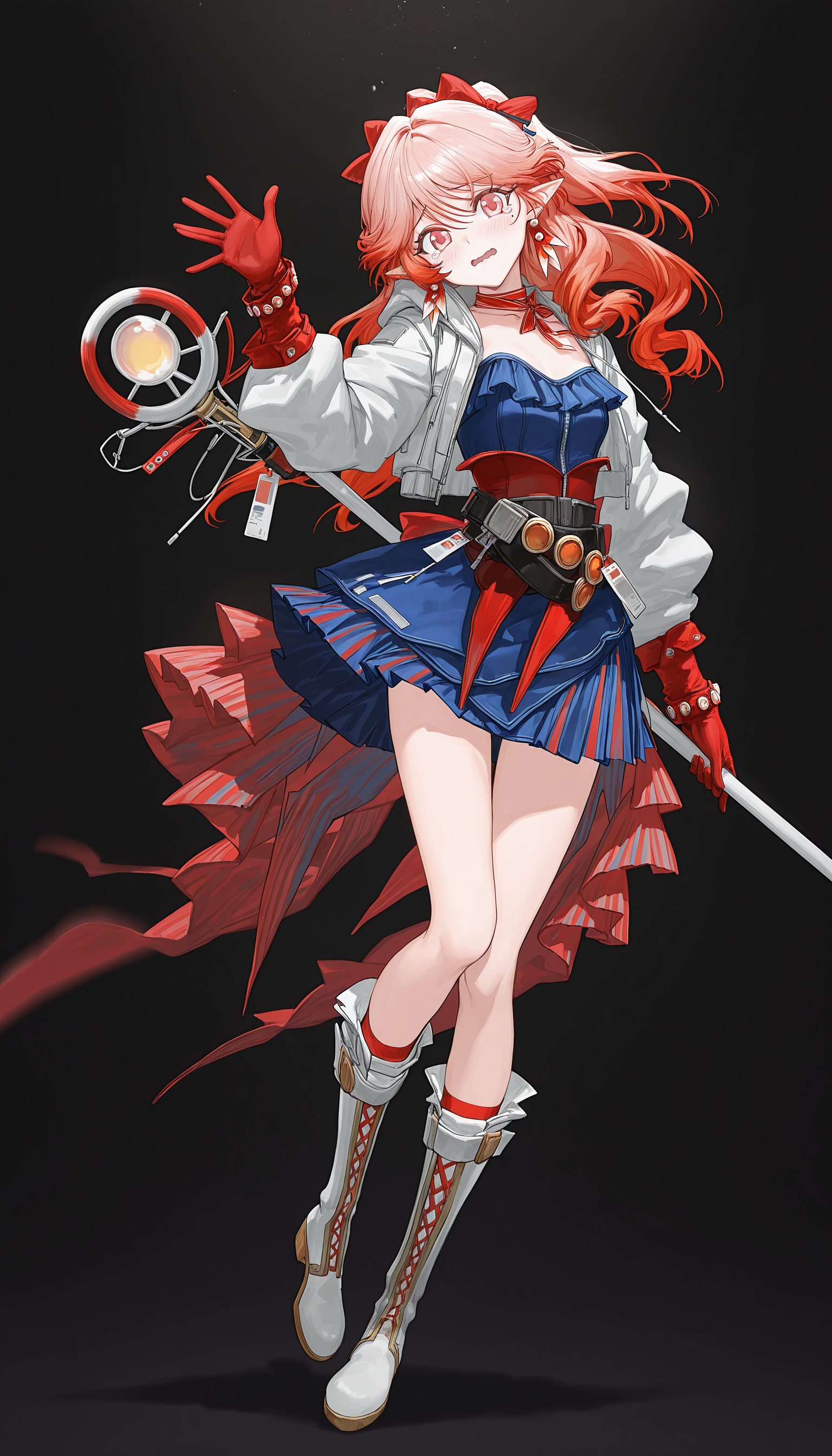white_jacket, neck ribbon, ribbon,blue_dress,belt,red_gloves, bracelet , jewelry , belt , red corset , overskirt,