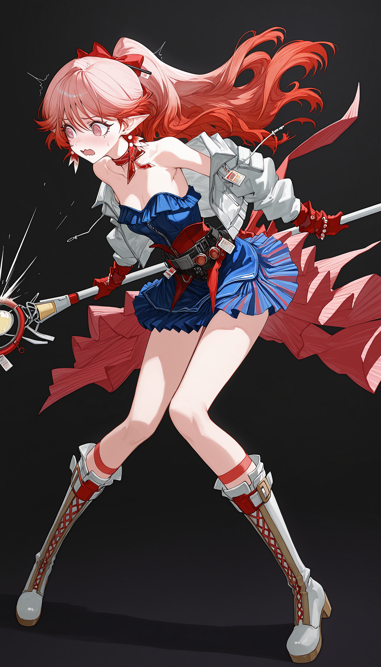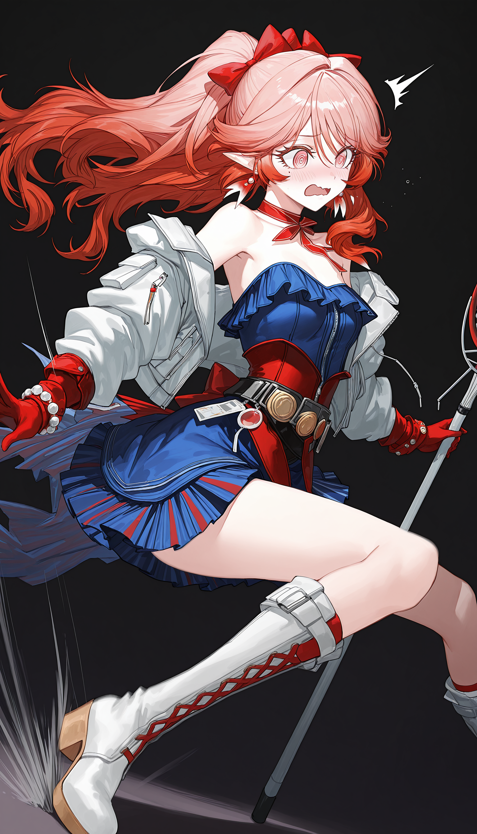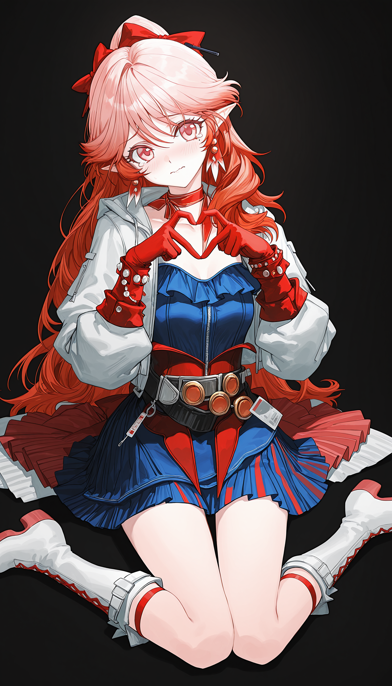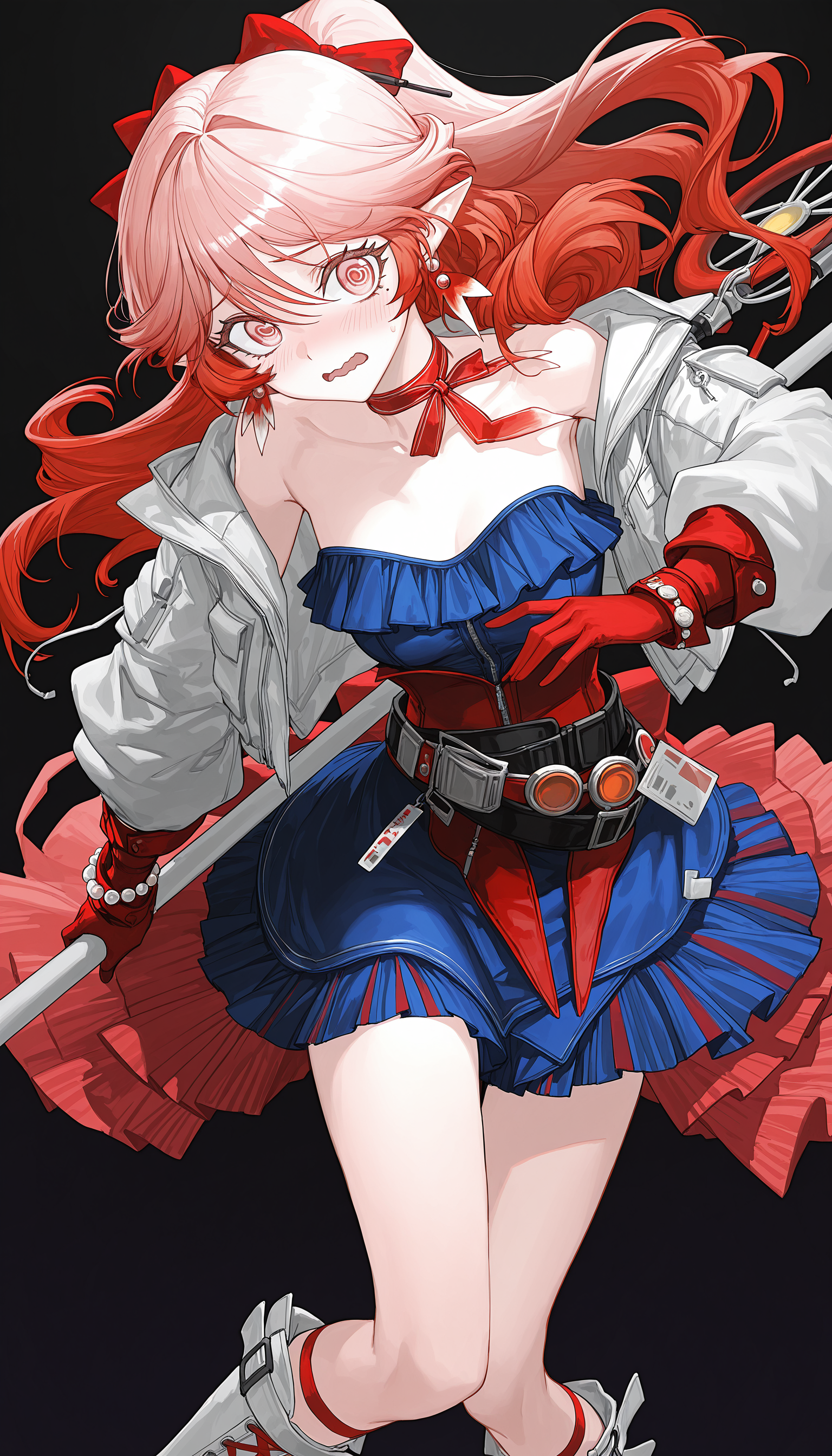 white_jacket, neck ribbon, ribbon,blue_dress,belt,red_gloves, bracelet , jewelry , belt , red corset , overskirt,