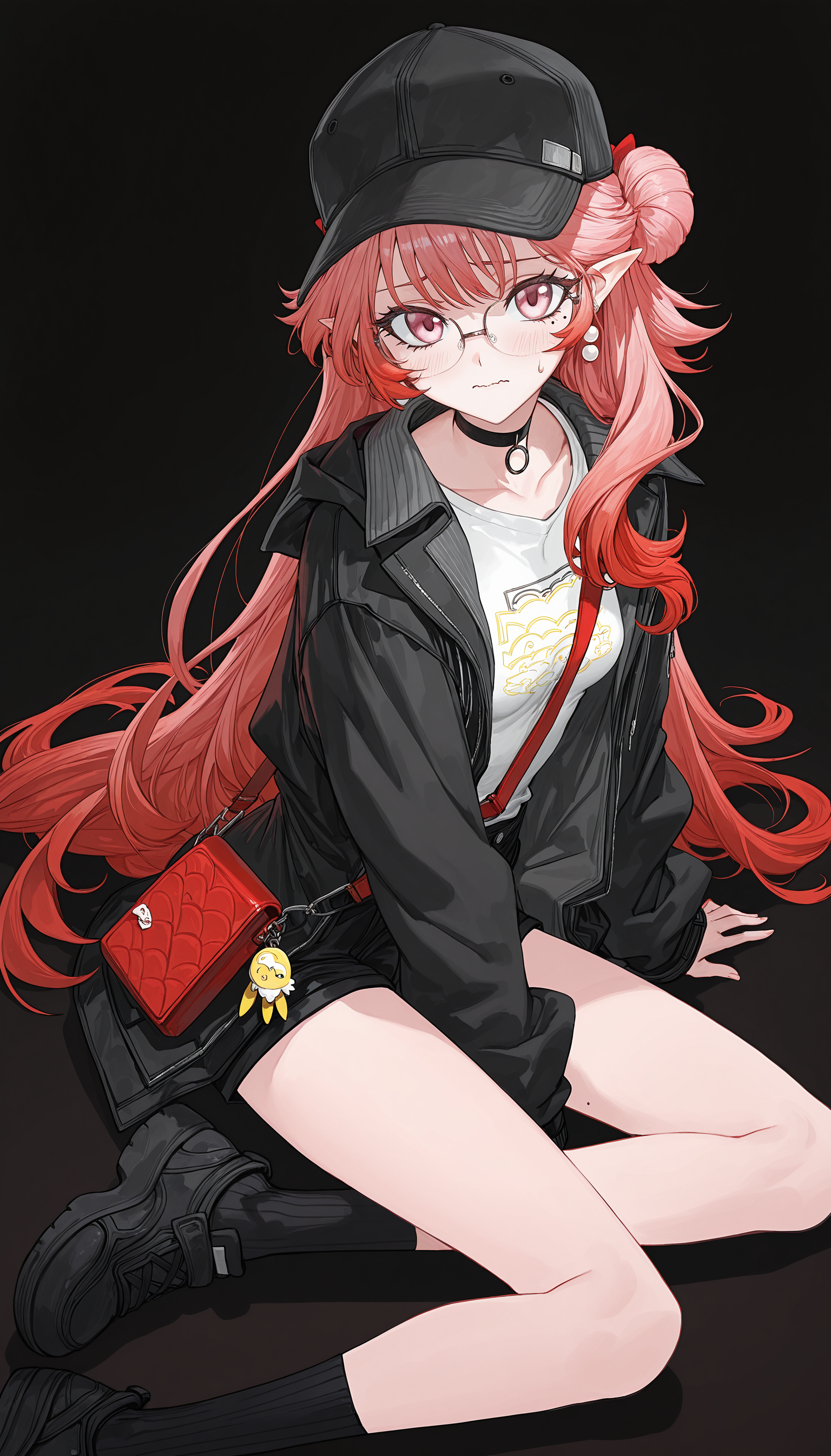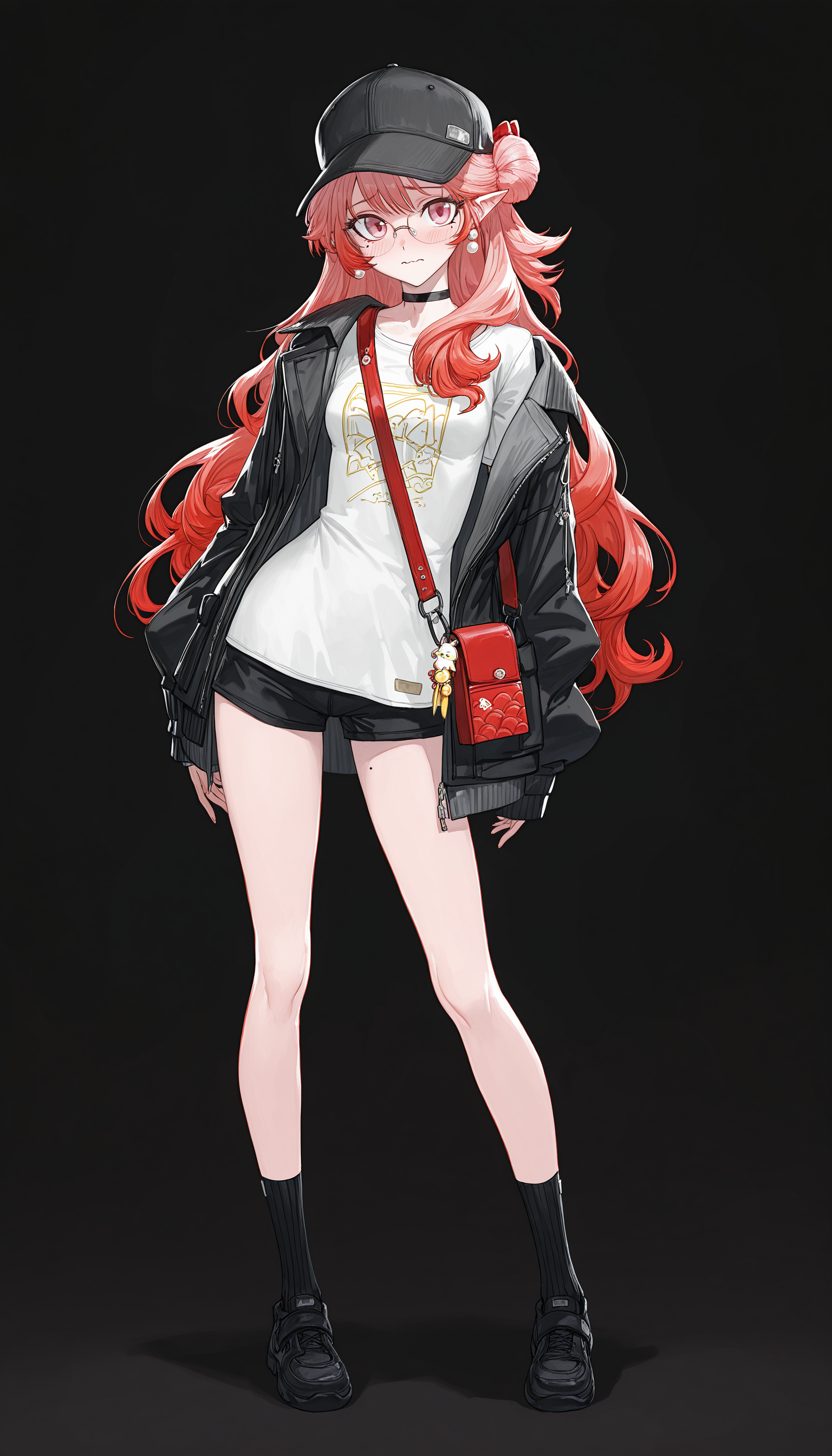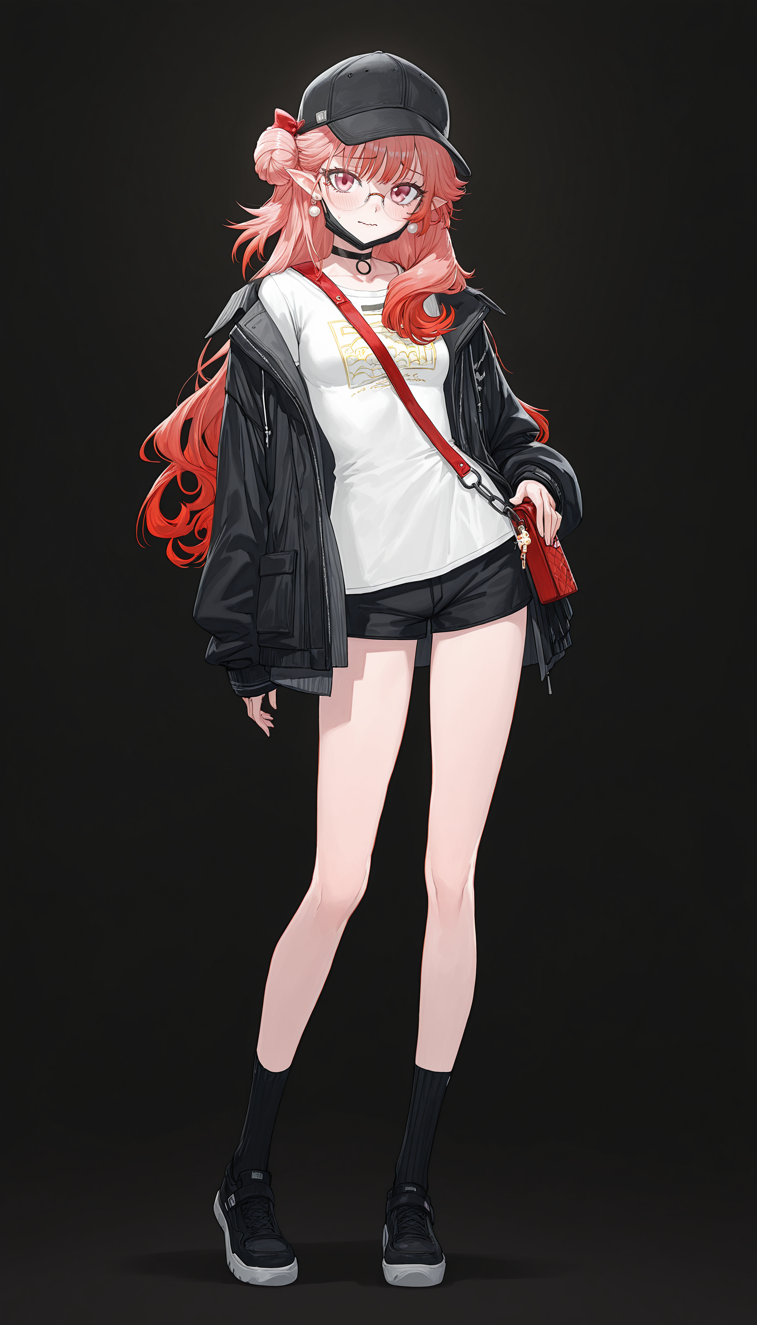 baseball cap , black choker, open clothes, black jacket, black shorts, shoulder bag , white t-shirt,