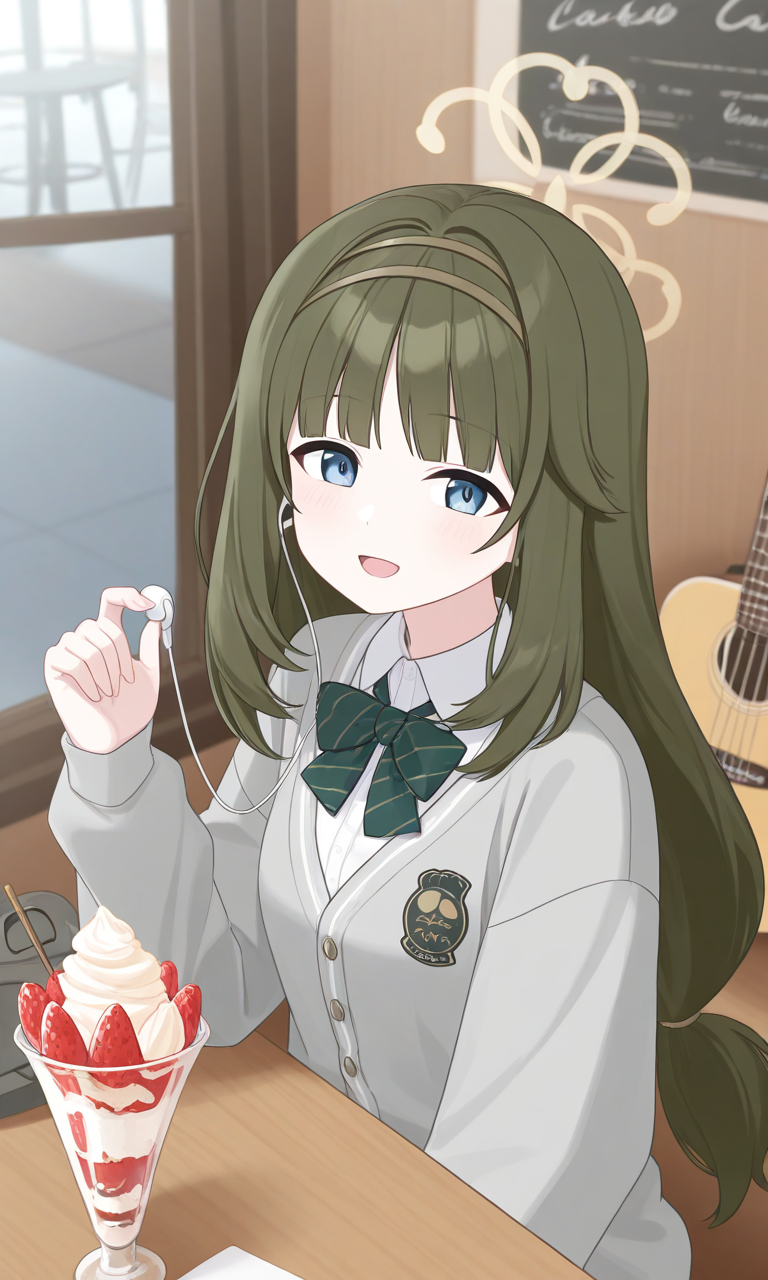 shiina tsumugi, hairband, low-tied long hair, halo, green bowtie, grey cardigan, white shirt, collared shirt, pleated skirt, plaid skirt, black skirt