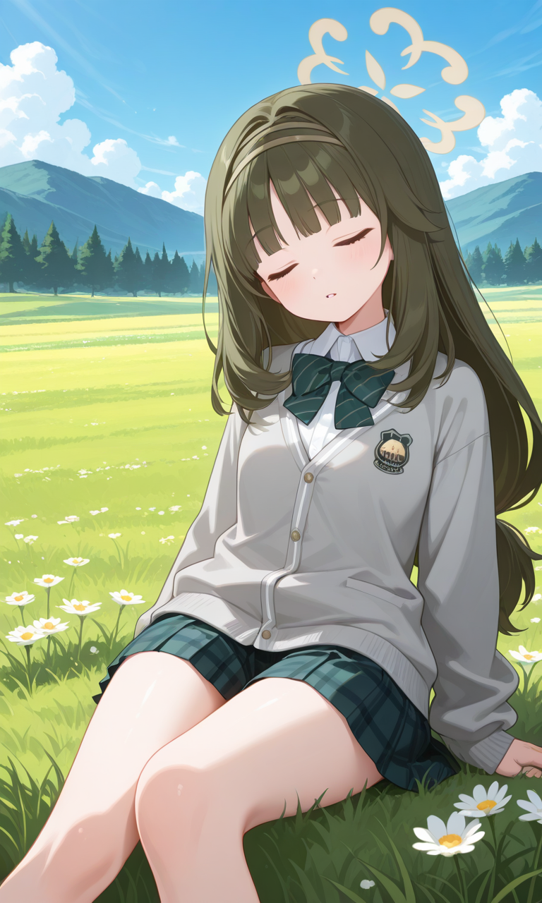 • shiina tsumugi, hairband, low-tied long hair, halo, green bowtie, grey cardigan, white shirt, collared shirt, pleated skirt, plaid skirt, black skirt