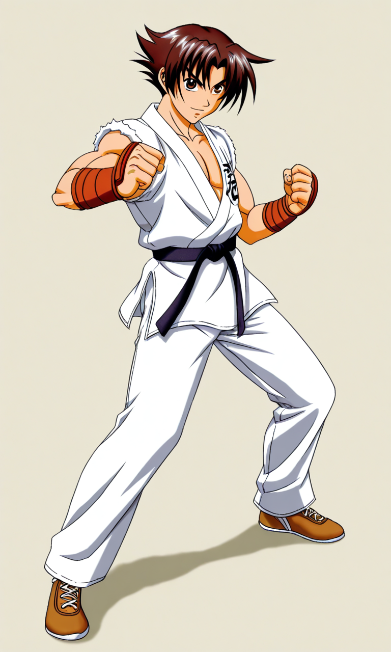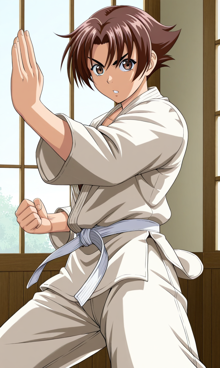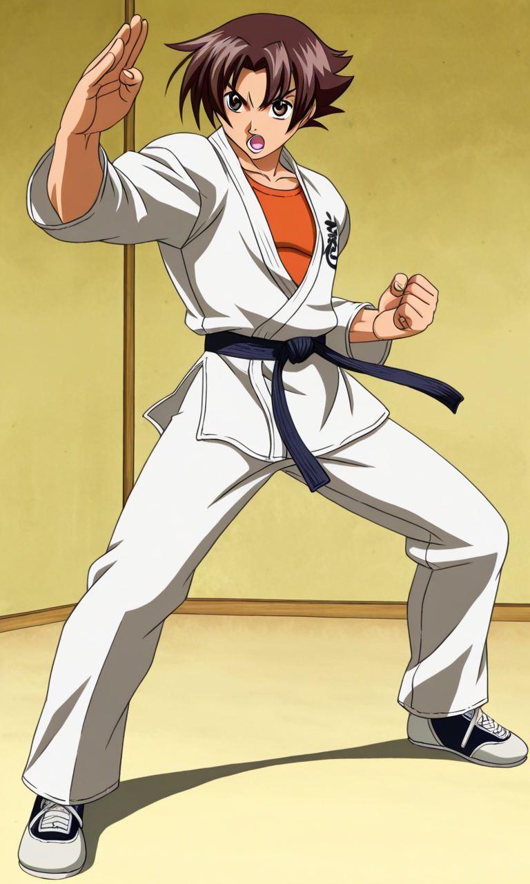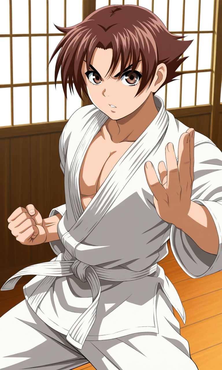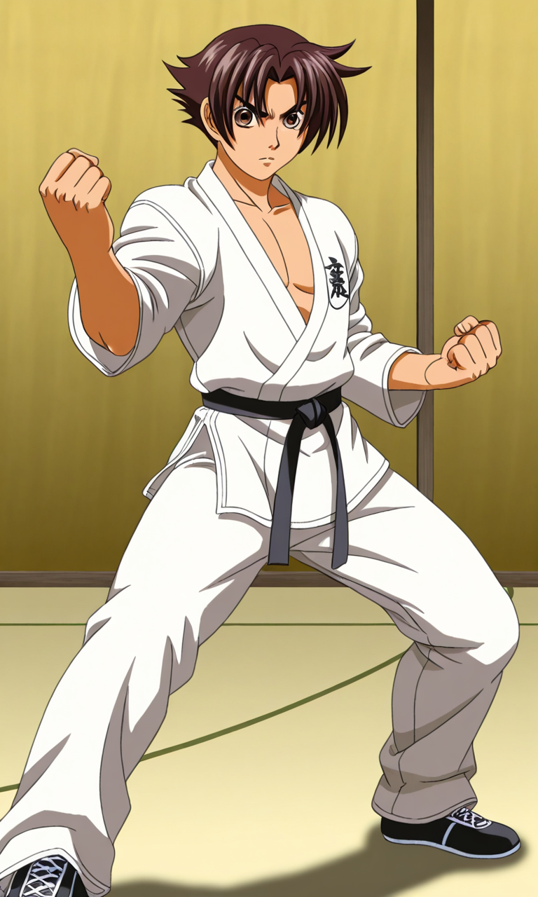 Shirahama Kenichi (Shijou Saikyou no Deshi Kenichi), brown hair, short hair, brown eyes, training attire: karate and jiu-jitsu dougi, Muay Thai belts, and Kung Fu pants and shoes, uses Muay Thai straps on his hands, wear wrist guards