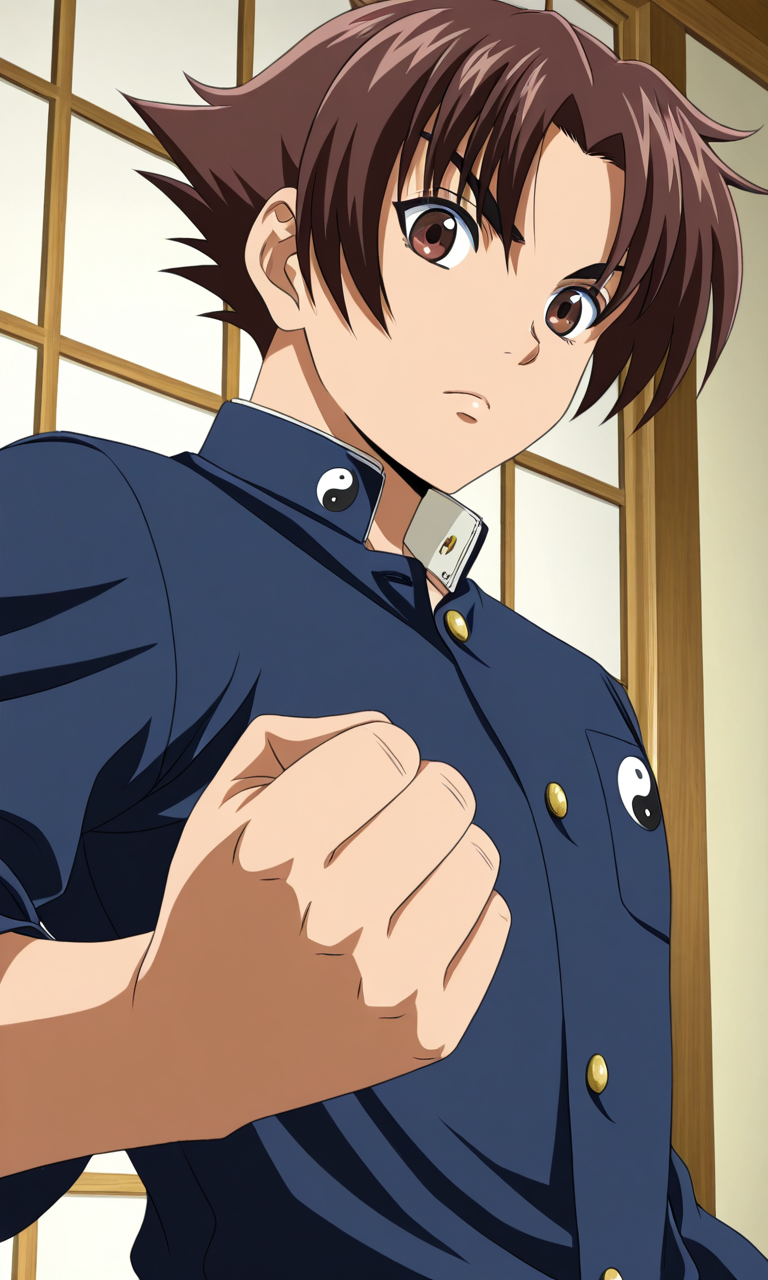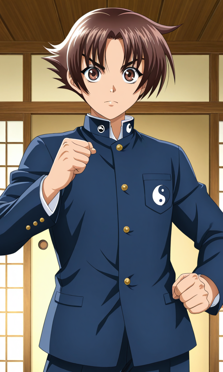 Shirahama Kenichi (Shijou Saikyou no Deshi Kenichi), brown hair, short hair, brown eyes, yin-yang badge, badge on collar, yin-yang badge