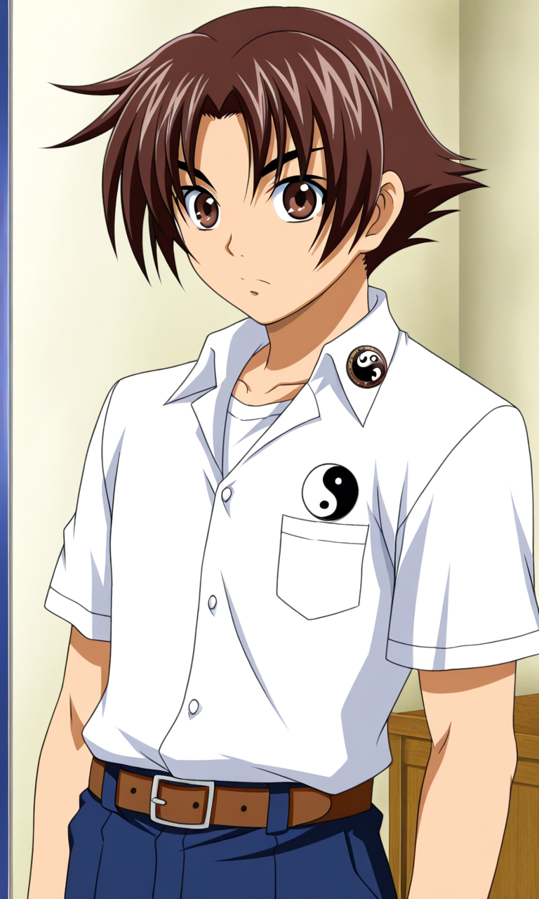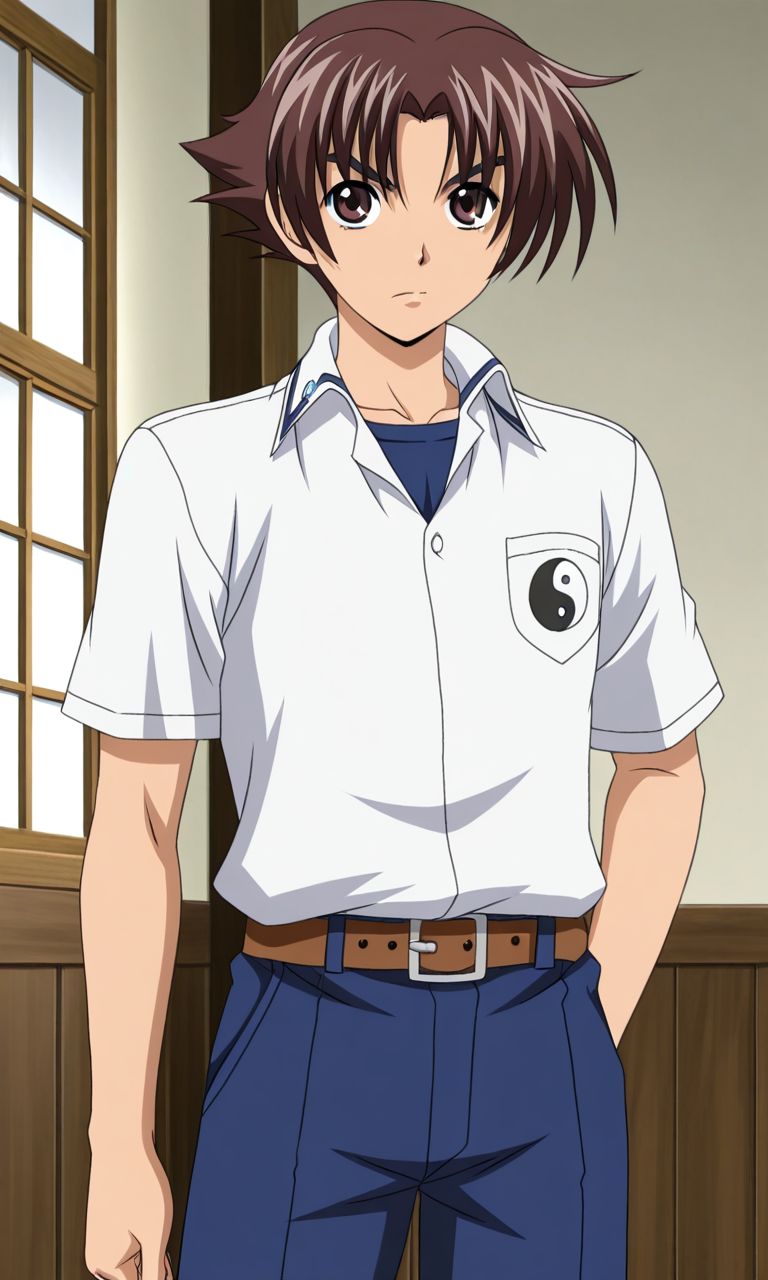 Shirahama Kenichi (Shijou Saikyou no Deshi Kenichi), brown hair, short hair, brown eyes, yin-yang badge, badge on collar, yin-yang badge, school uniform, white shirt, blue pants, belt