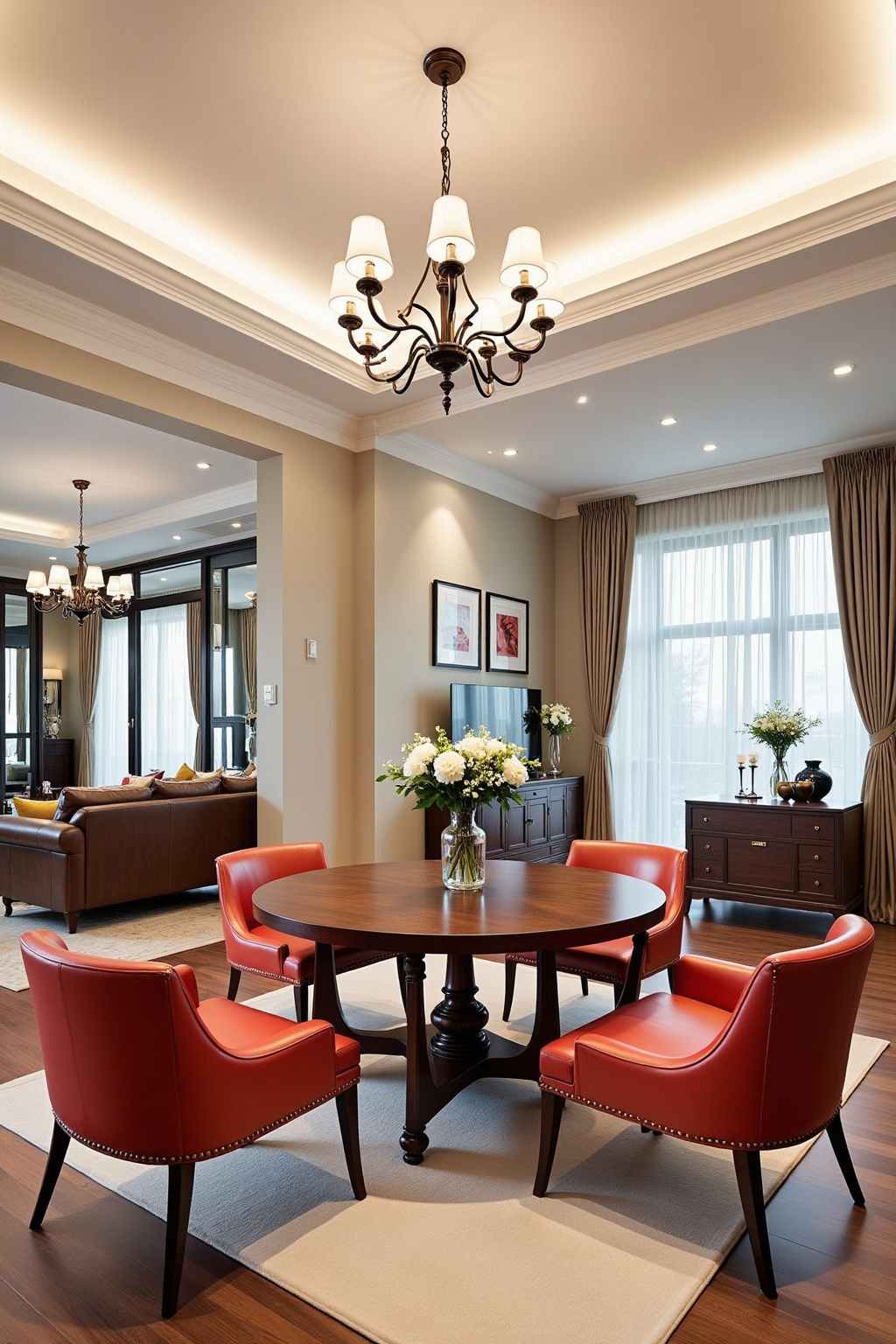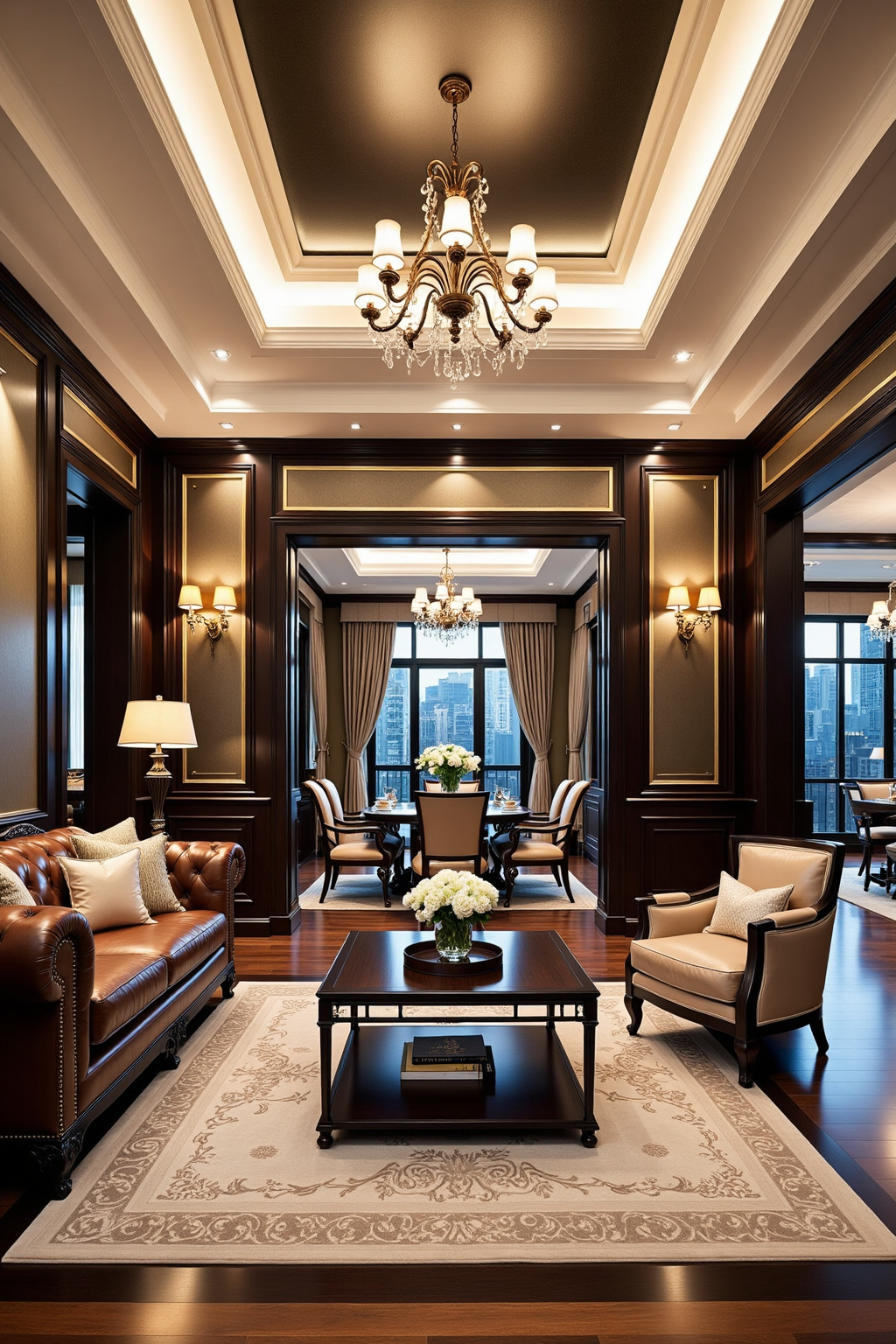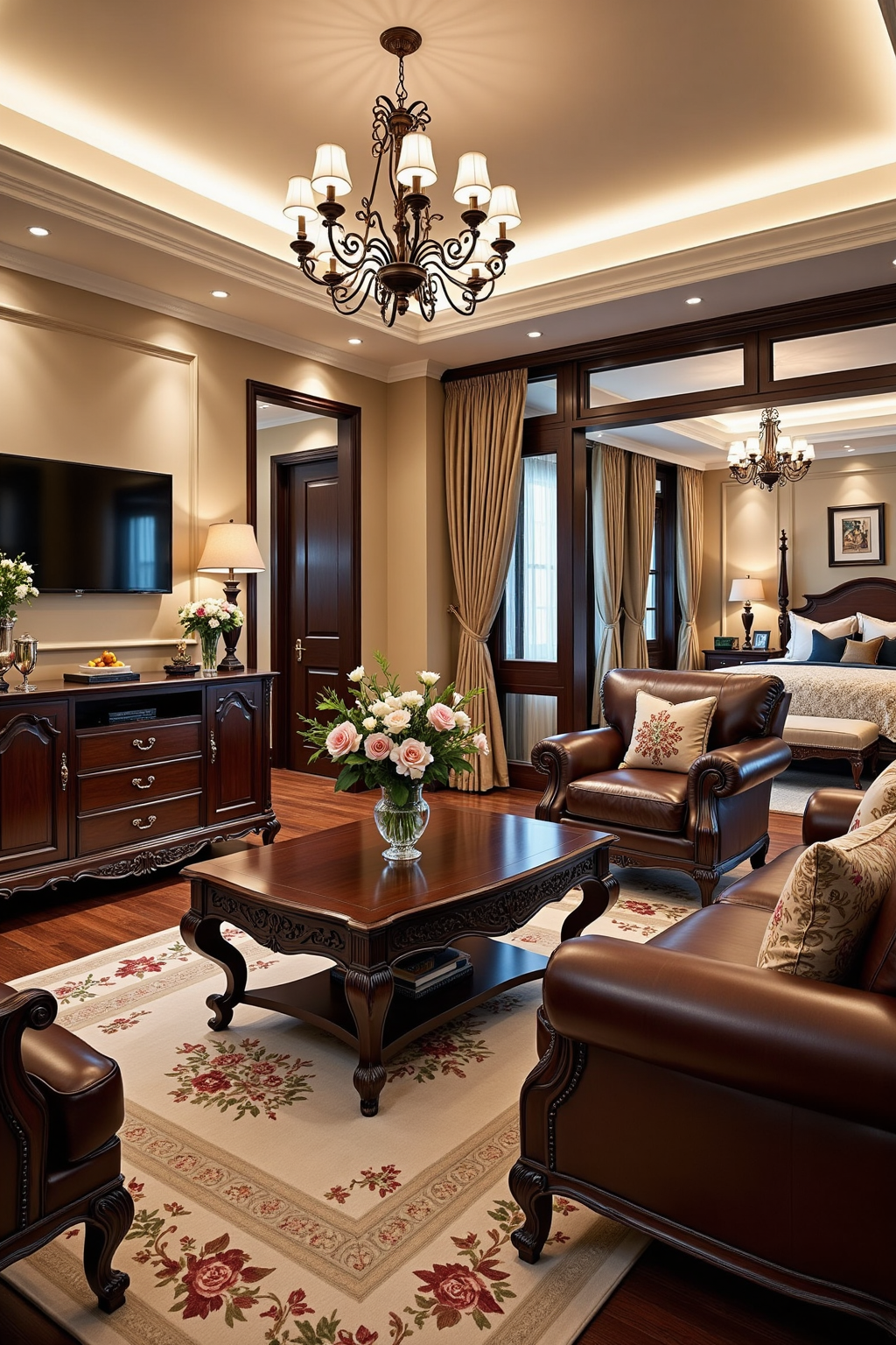 Interior decoration style, classic American, dark wood furniture, leather sofas, chandeliers, warm tones, combined living - dining - kitchen, cozy bedroom with elegant decor.