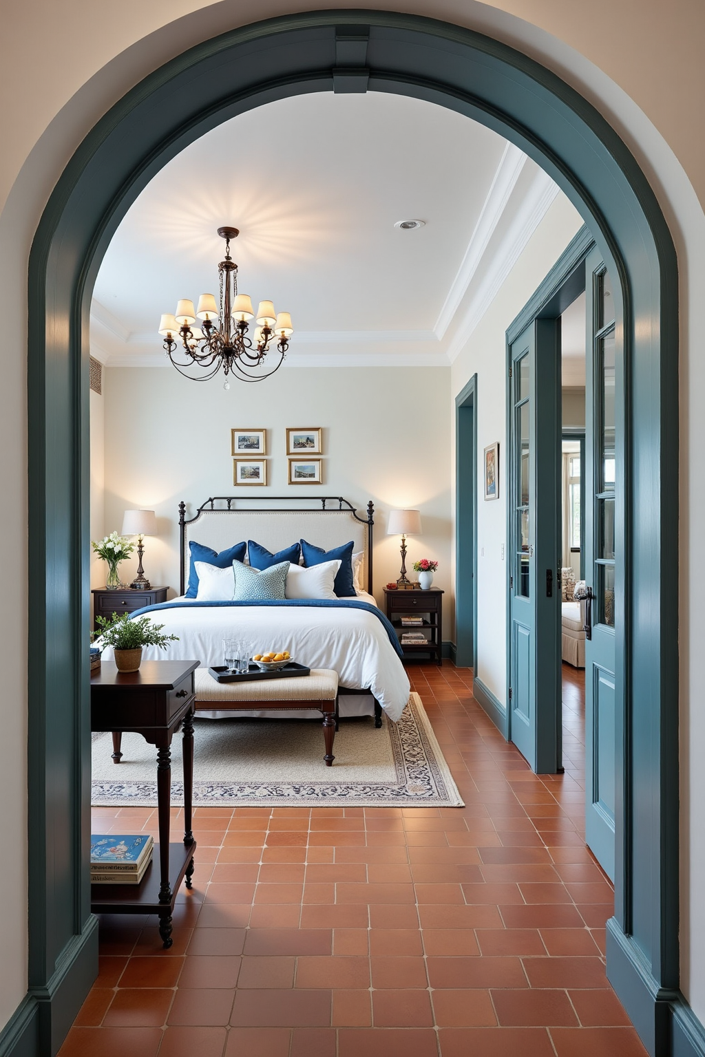 Interior decoration style, Mediterranean, terracotta tiles, arched doorways, wrought - iron details, blue - white tones, coastal - inspired decor, bright kitchen and bedroom.