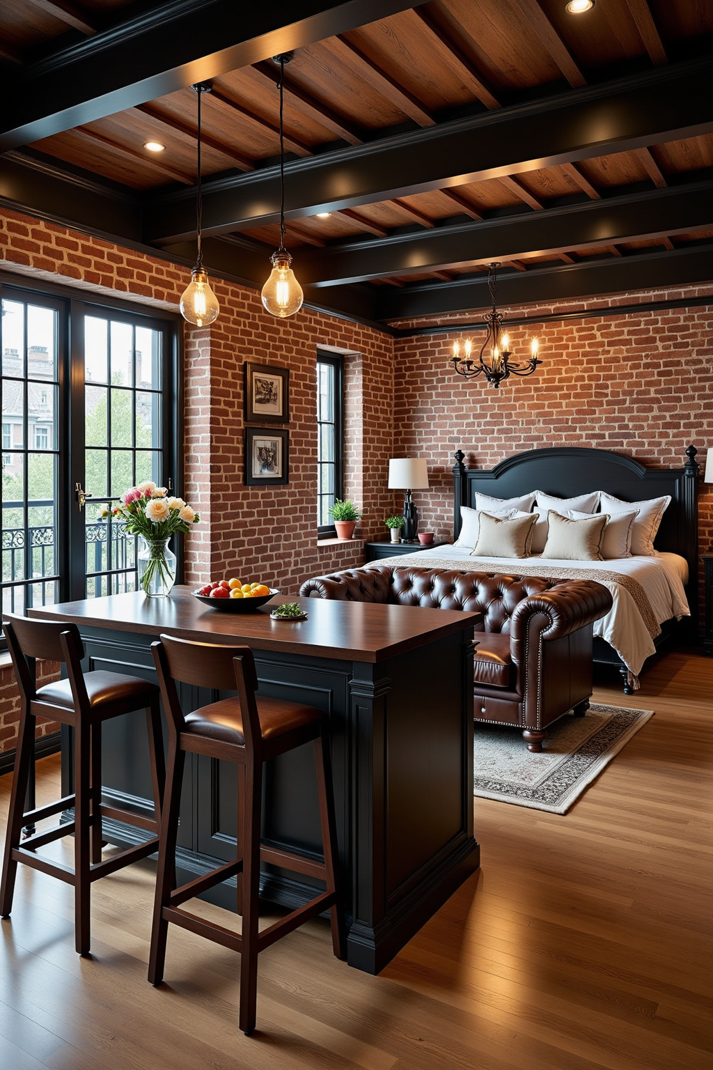 Interior decoration style, industrial, exposed brick, metal accents, dark wood, Edison bulbs, leather furniture, open kitchen with bar stools, raw - toned bedroom.
