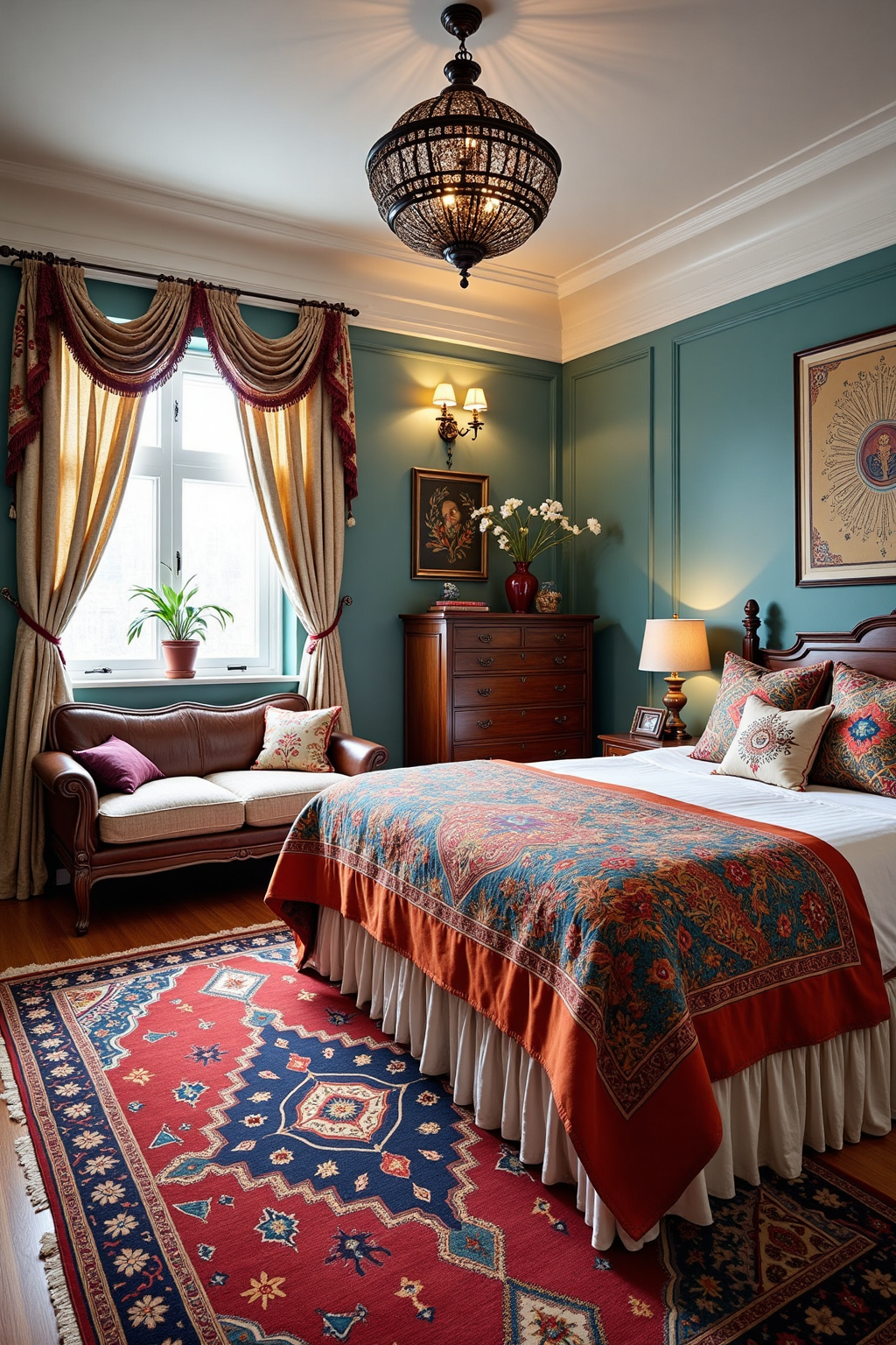 Interior decoration style, Bohemian, eclectic decor, colorful textiles, macrame, global - inspired items, layered rugs, vibrant bedroom, artistic living space.