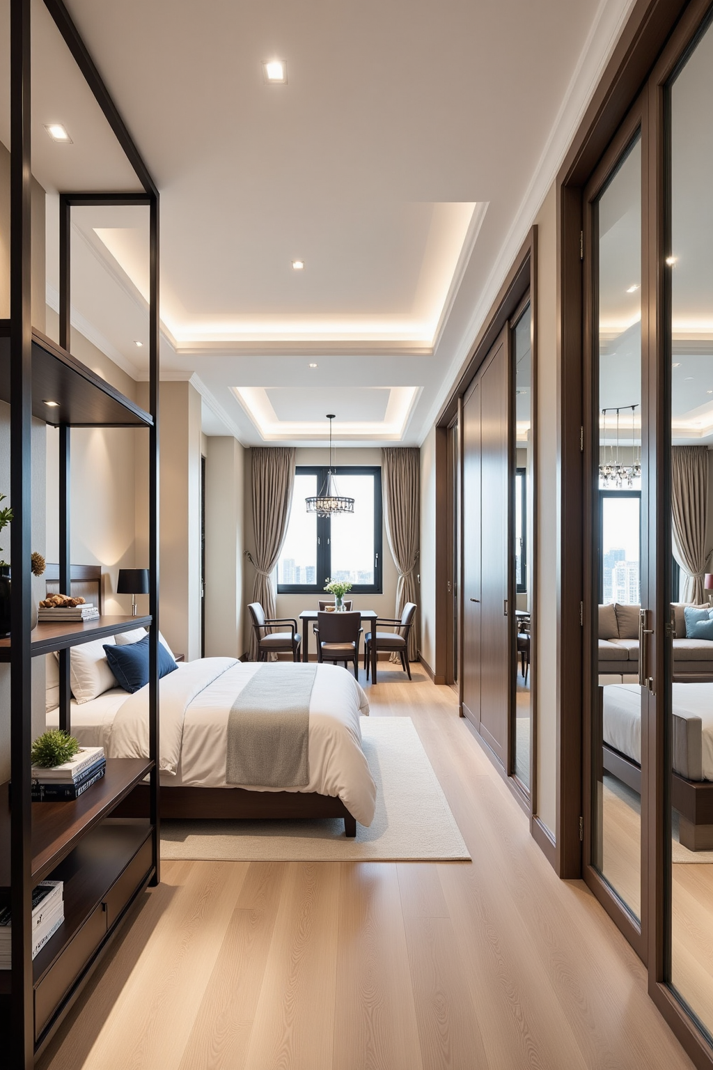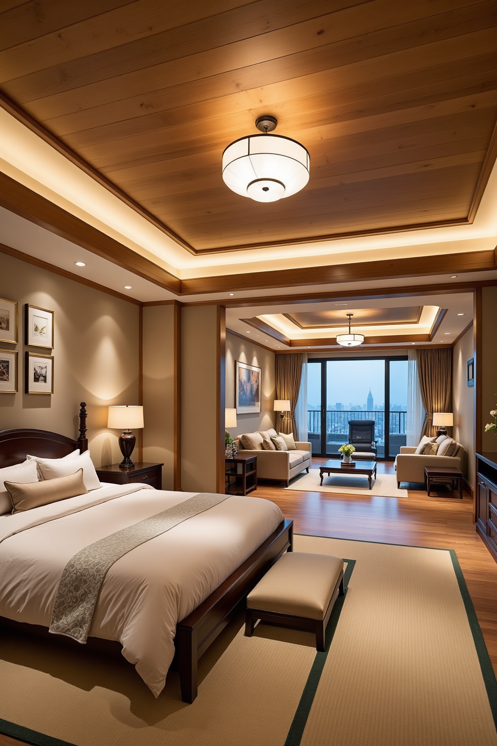 Interior decoration style, modern minimalist, clean lines, neutral colors, open layout, simple lighting, functional furniture, uncluttered bedroom and living areas.