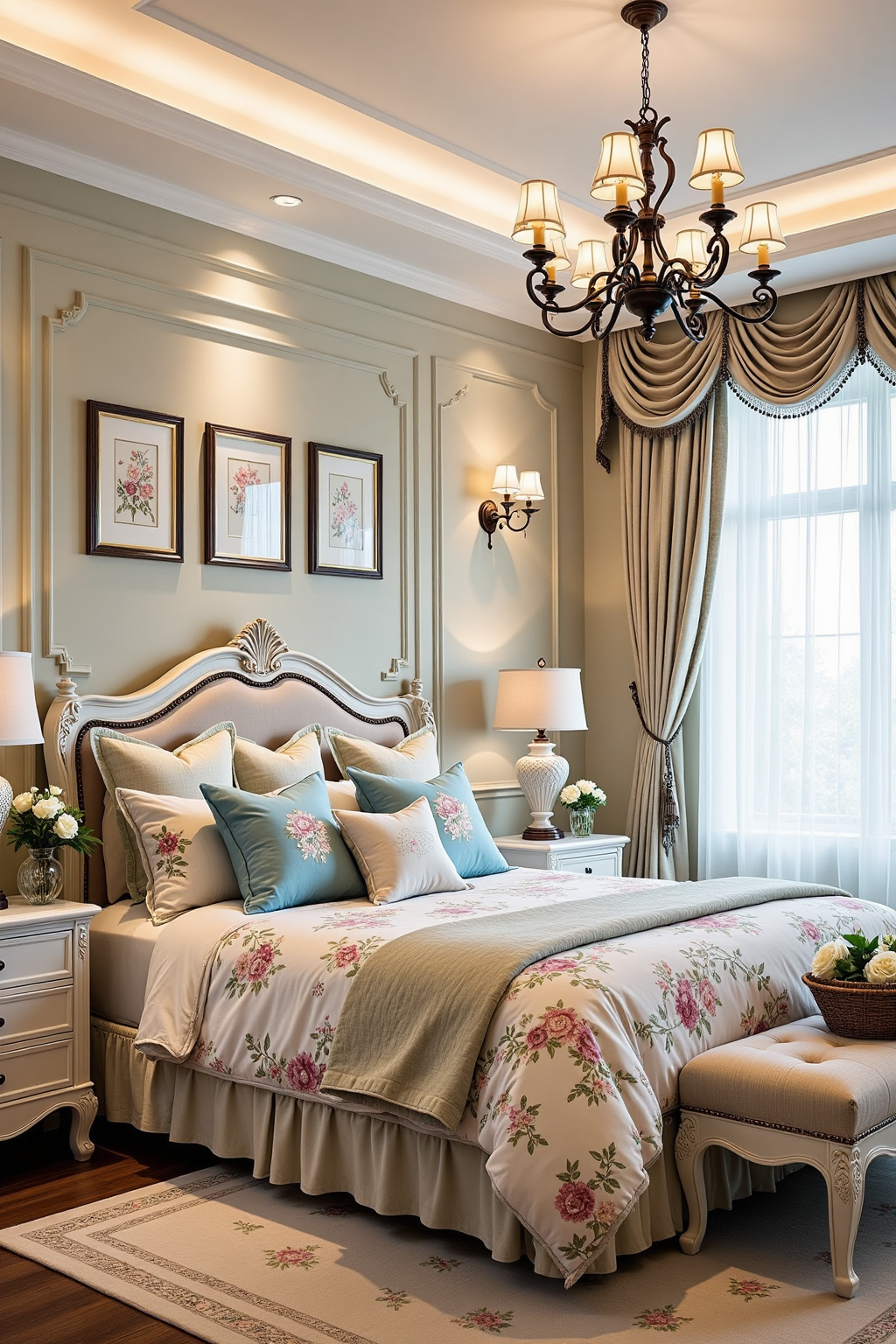 Interior decoration style, French country, distressed wood, floral patterns, wrought - iron chandeliers, pastel colors, romantic bedroom, cozy living room with carved furniture.