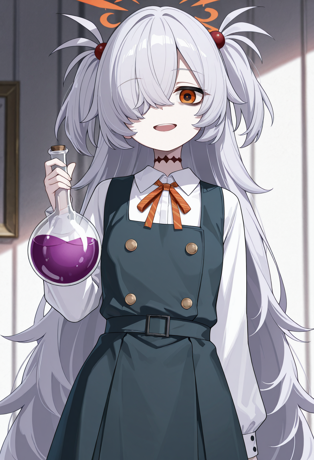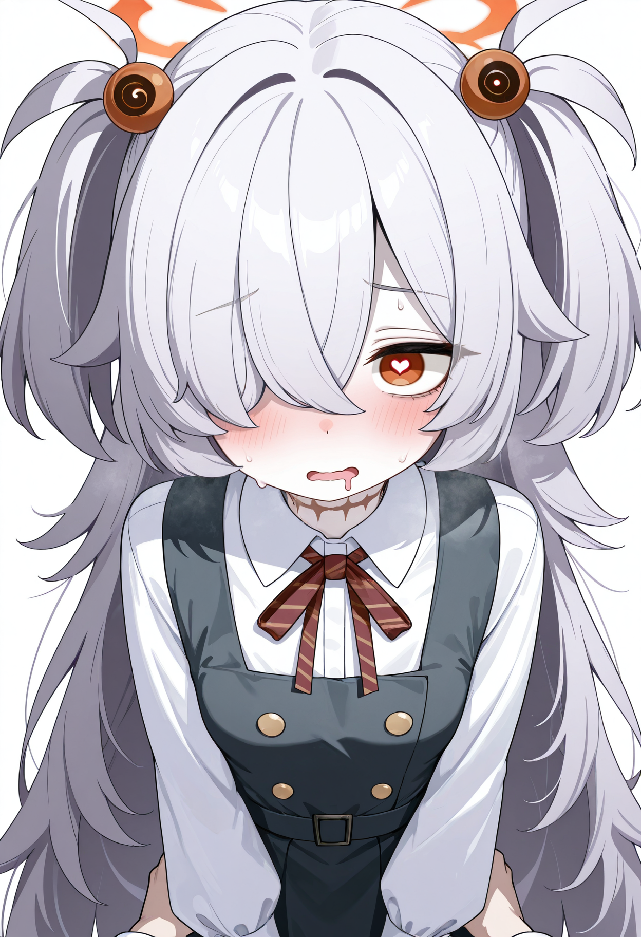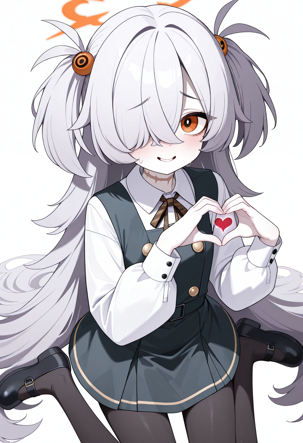 brown eyes, brown halo, grey hair, halo, two side up, hair ornament
