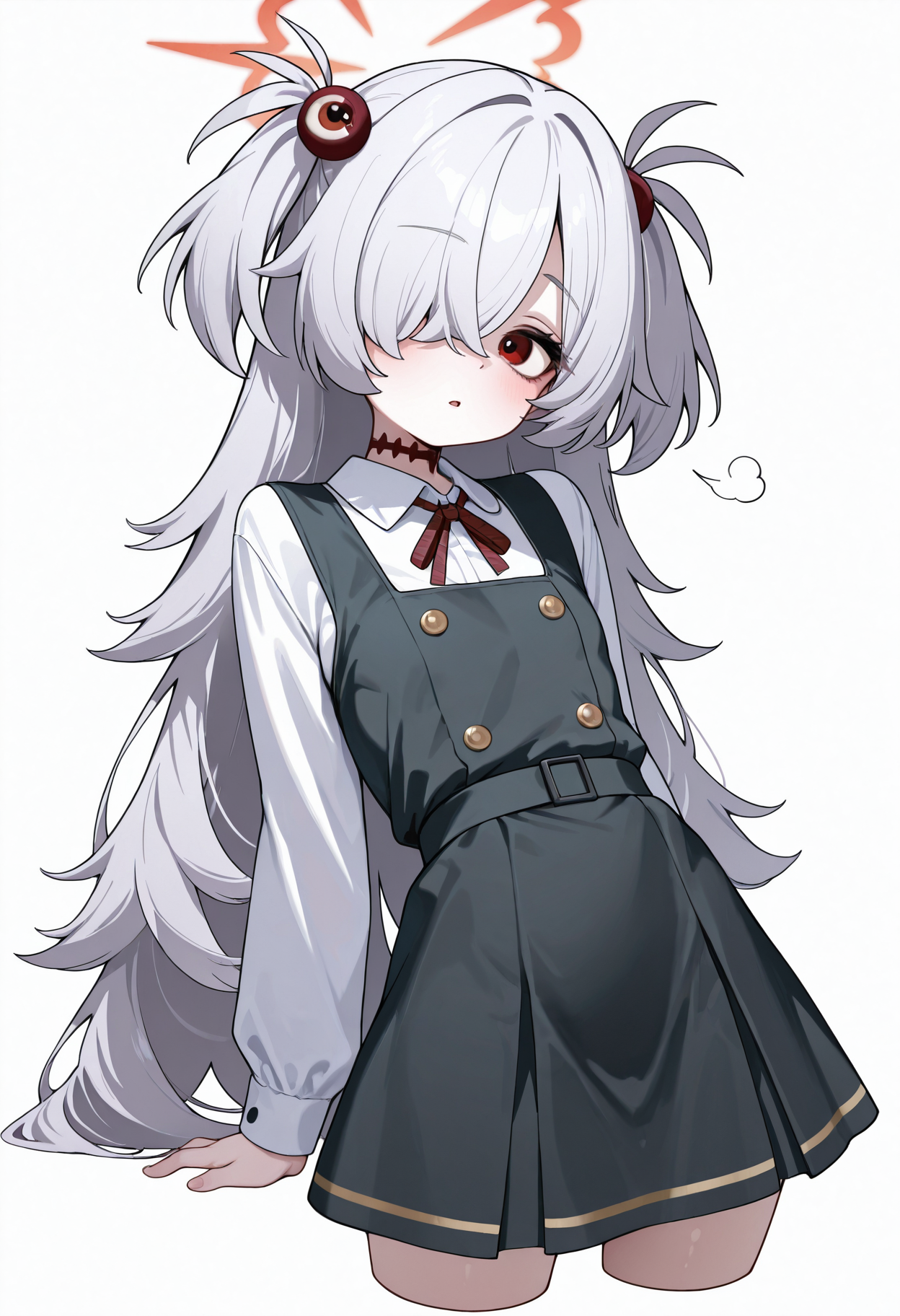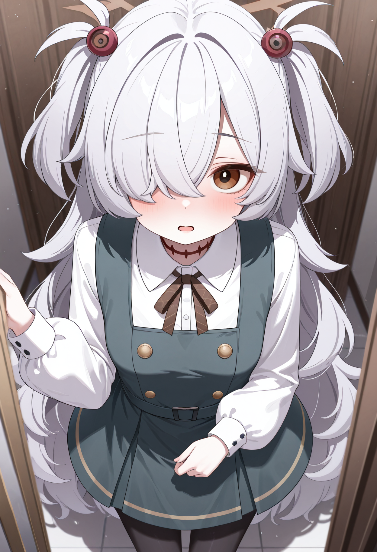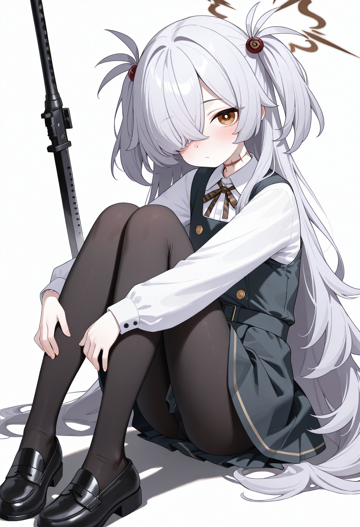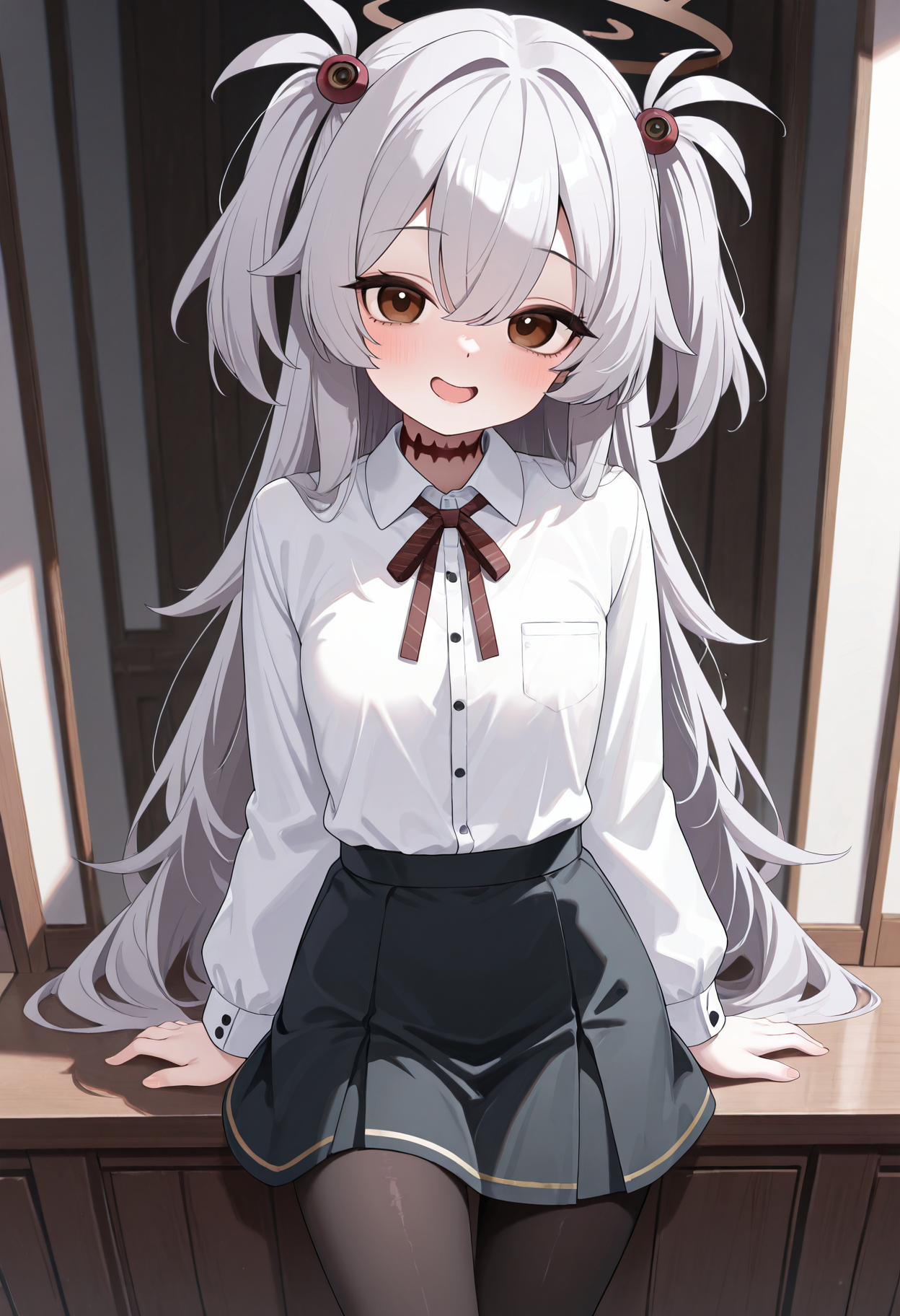 brown eyes, brown halo, grey hair, halo, two side up, hair ornament