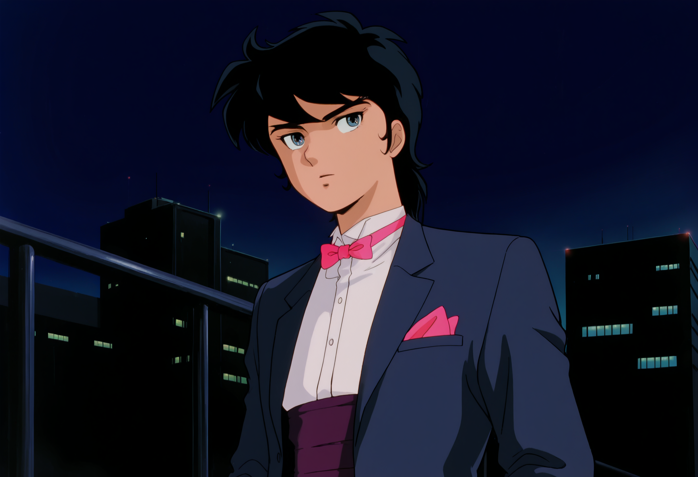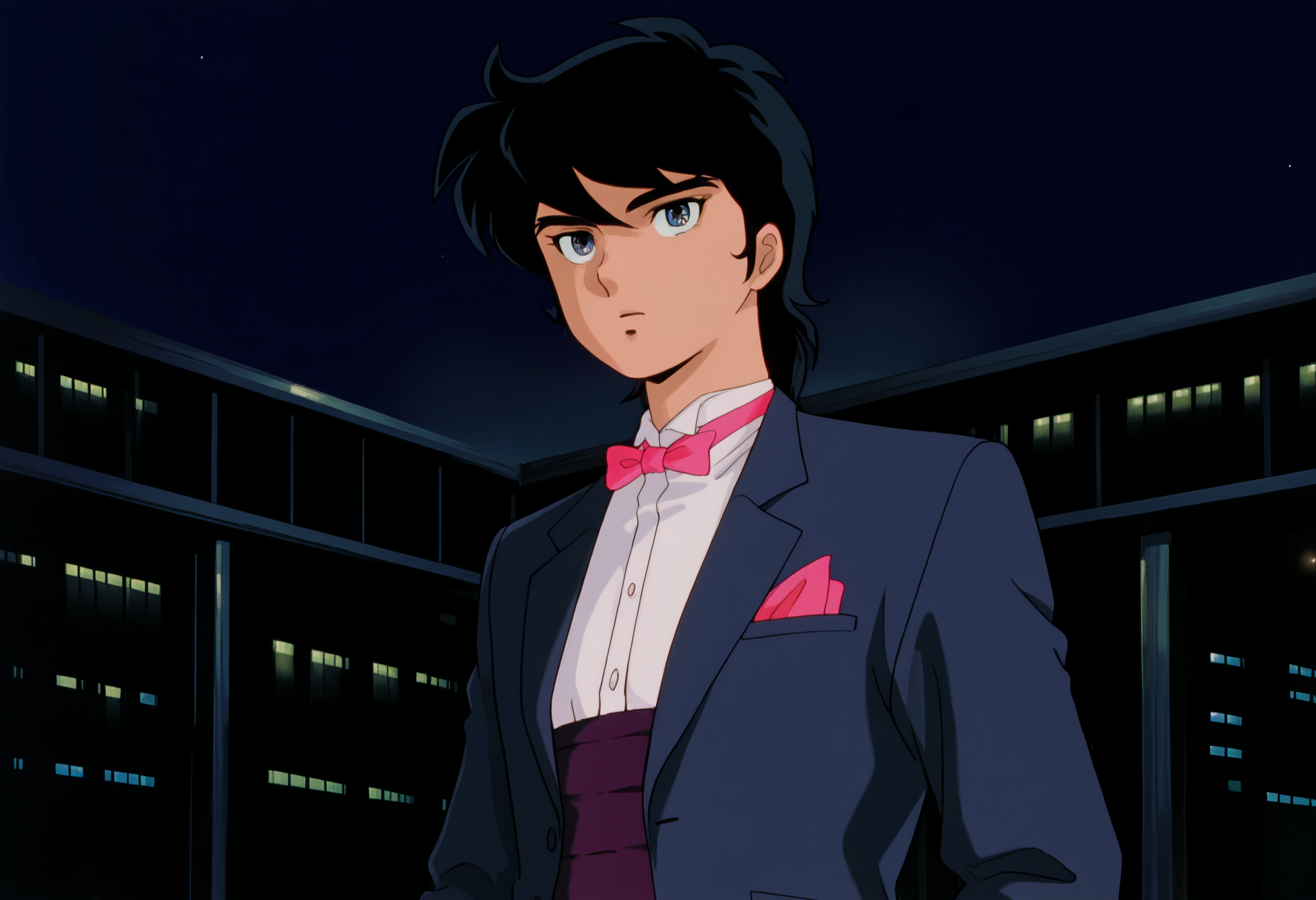 ryo_sanada, bowtie, bow, pink bowtie, night, shirt, jacket, white shirt, pink bow, breast pocket, suit, formal, blue jacket