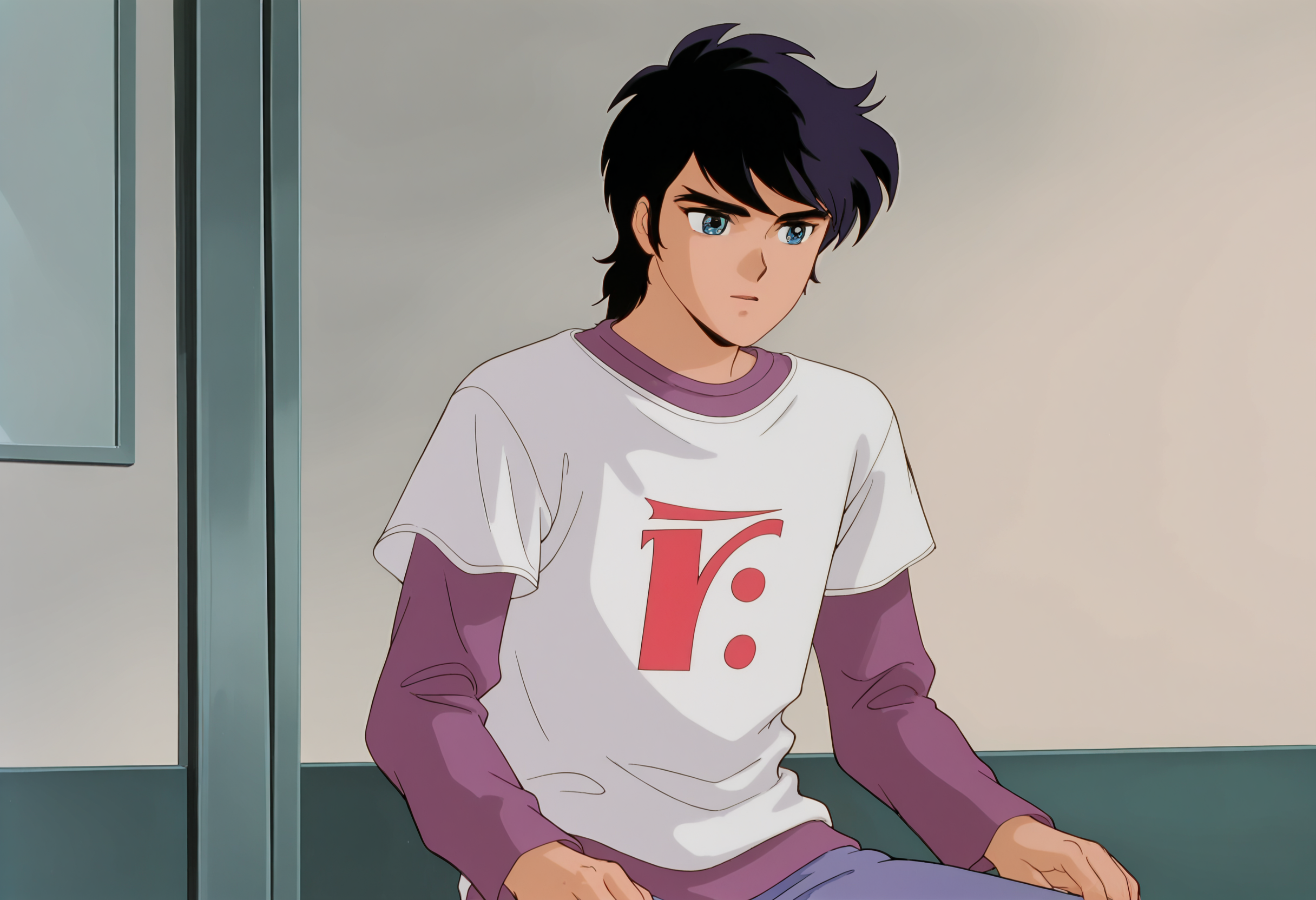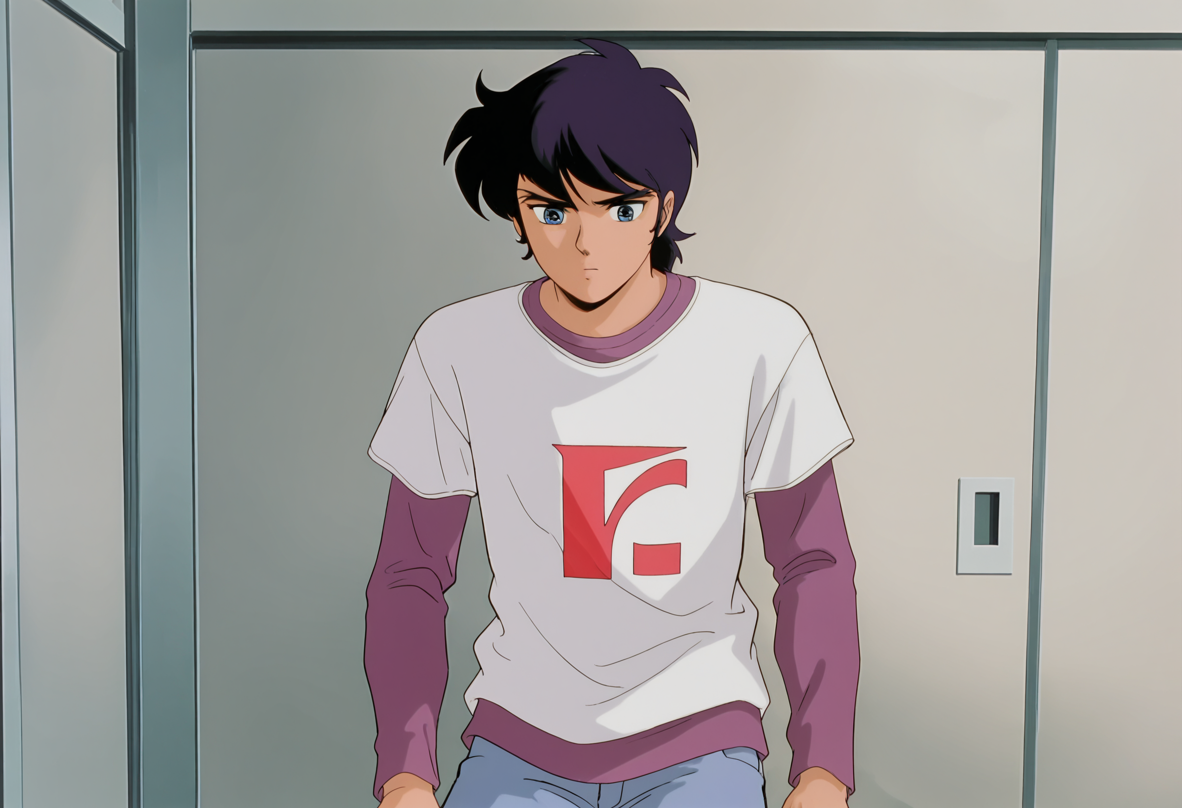 ryo_sanada, shirt, long sleeves, white shirt, t-shirt, purple shirt, short over long sleeves, short sleeves, layered sleeves