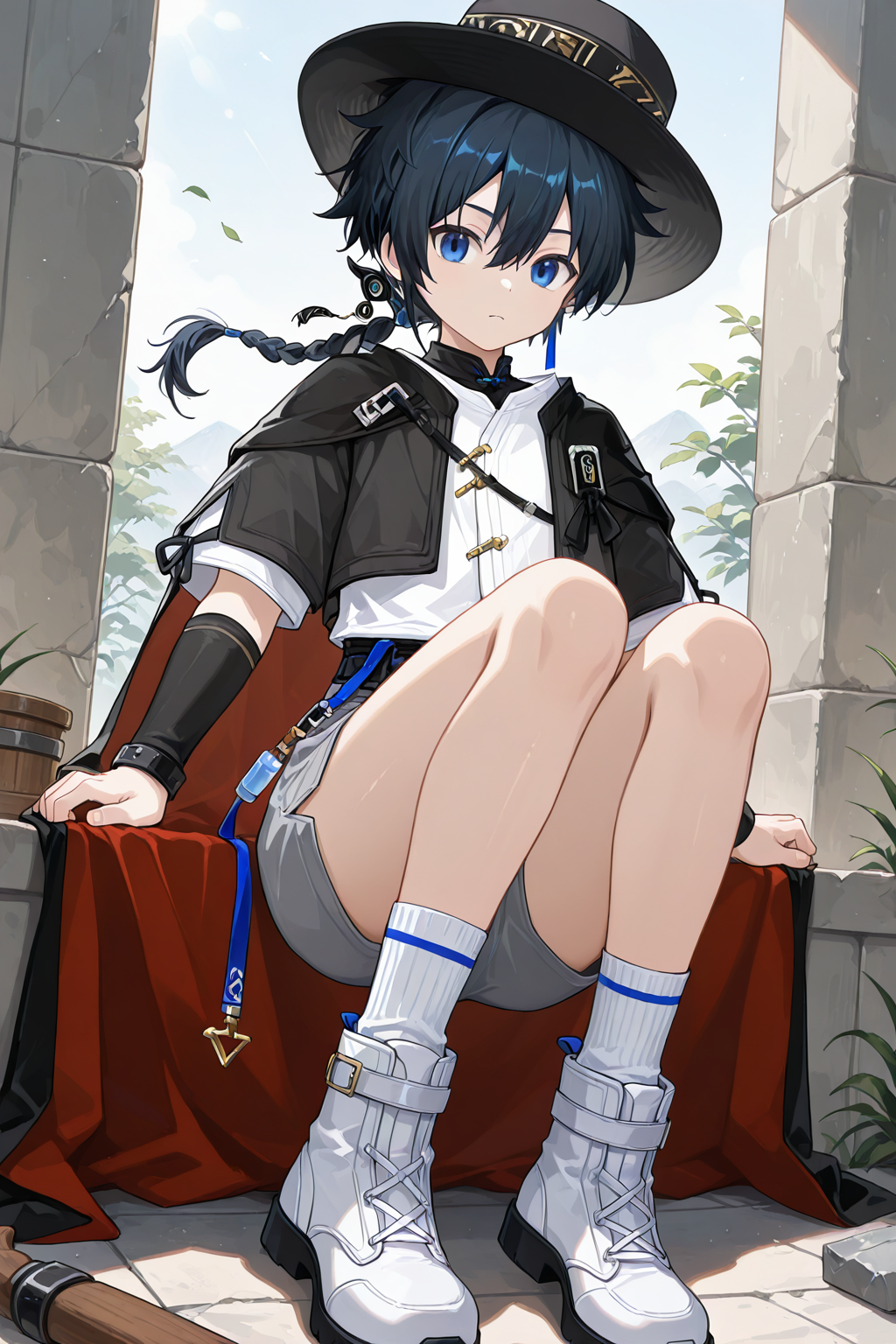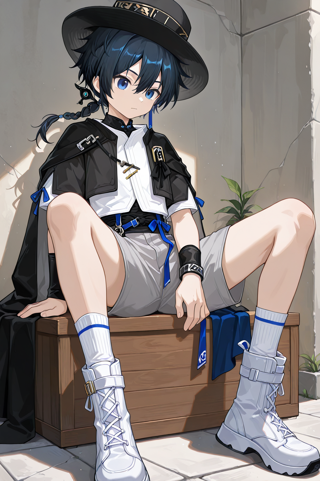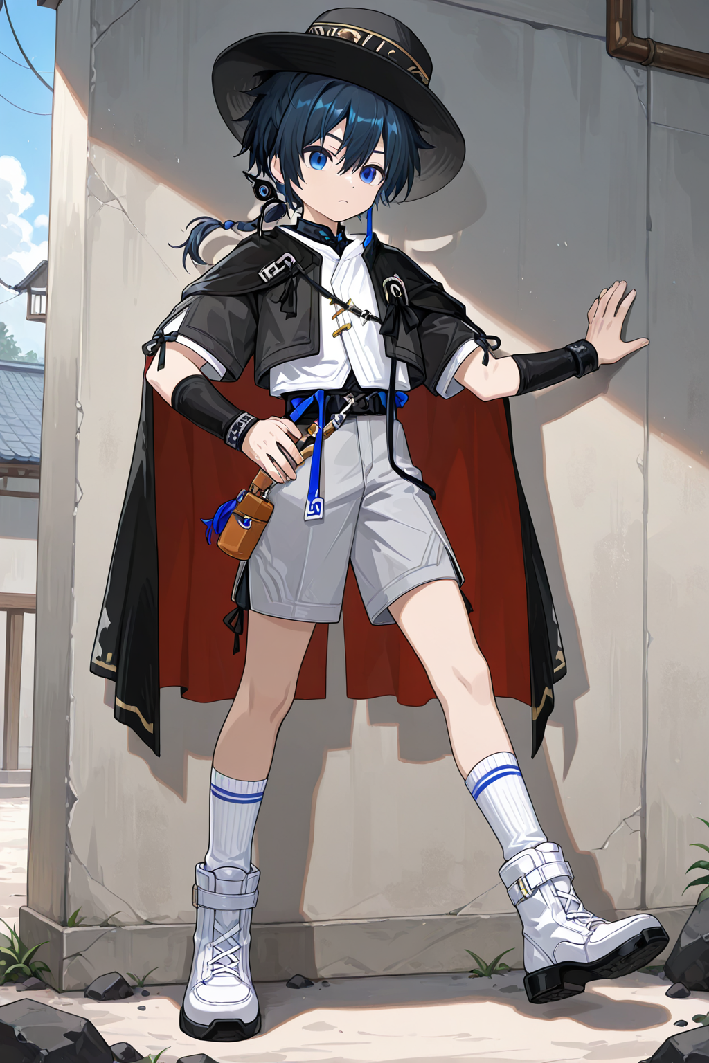 chonglan, blue_eyes, blue_hair, low_ponytail, black hat, black_hair, braid, jewelry, cape, chinese_clothes, grey_shorts, shorts, white_socks, boots, long_hair, white_footwear,