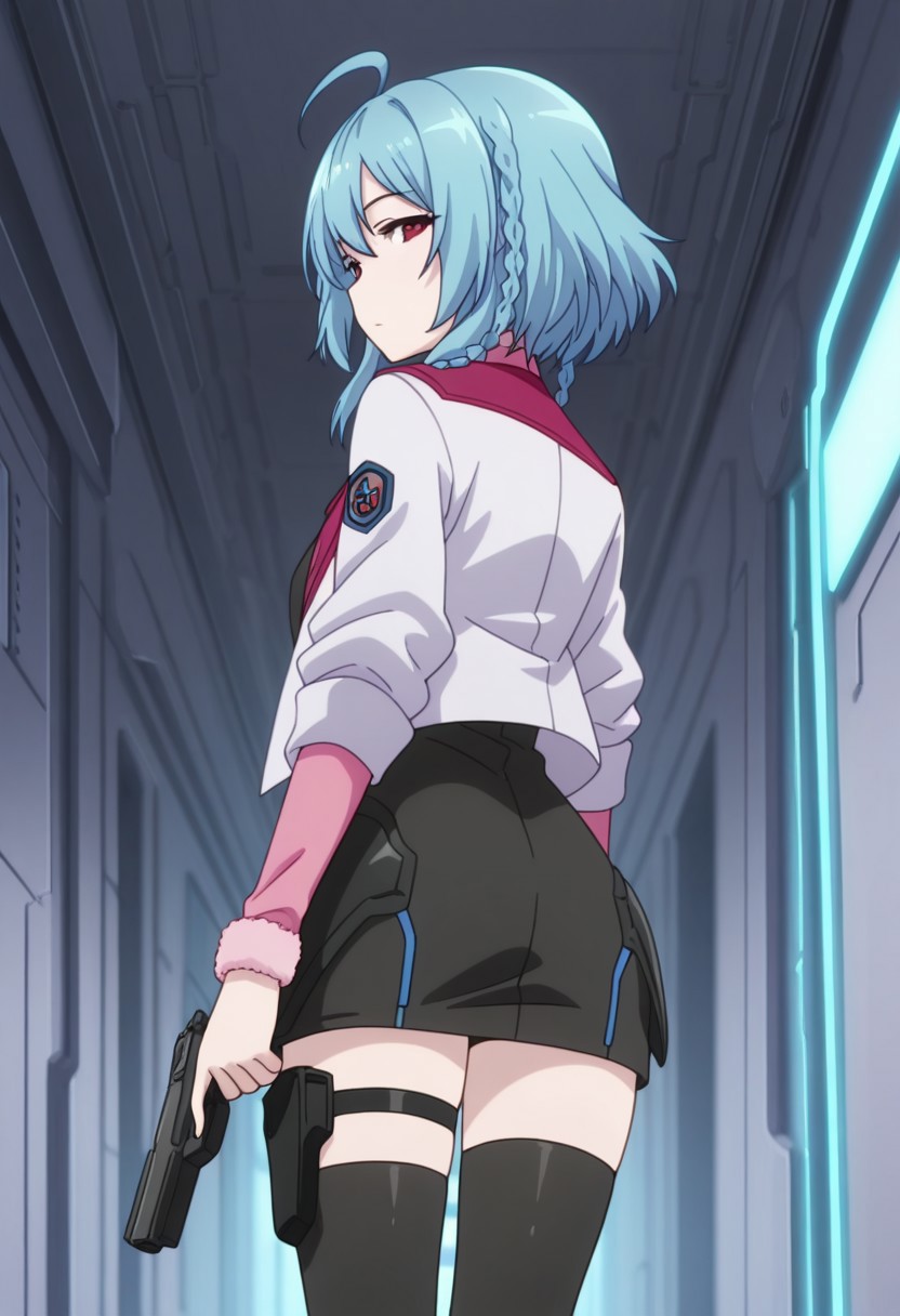 short hair, blue hair, double braids, red eyes, white jacket, black dress, necktie, thigh straps, thighhighs, holster,