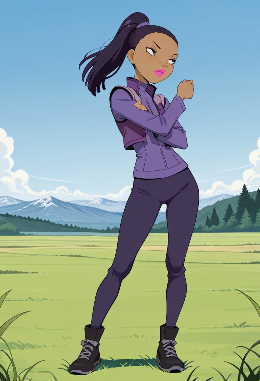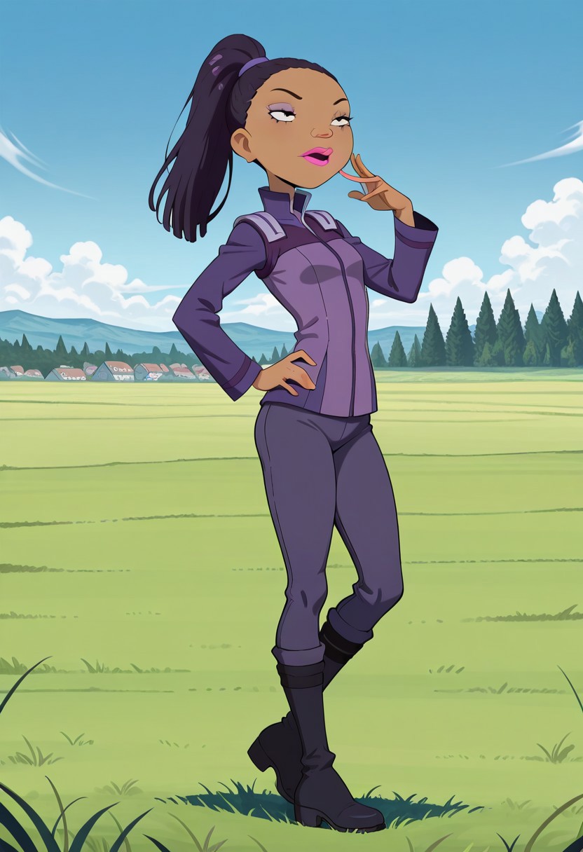 Miranda Killgallen, brown skin, curly dark purple hair, pink lipstick,