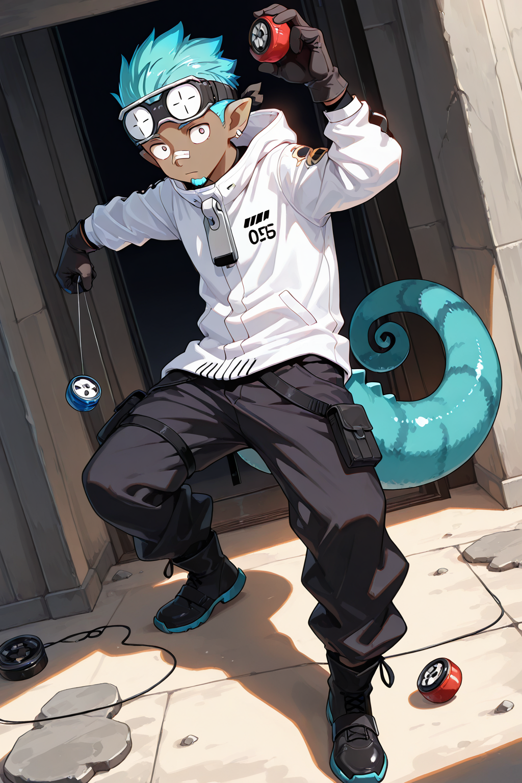 ethan, dark-skinned_male, aqua_hair, white_eyes, chameleon_tail, aqua_tail, default, white_jacket, goggles, goggles_on_head, black_pants, gloves, goatee, bandaid, yo-yo, black footwear, white_glass, pointy_ears,