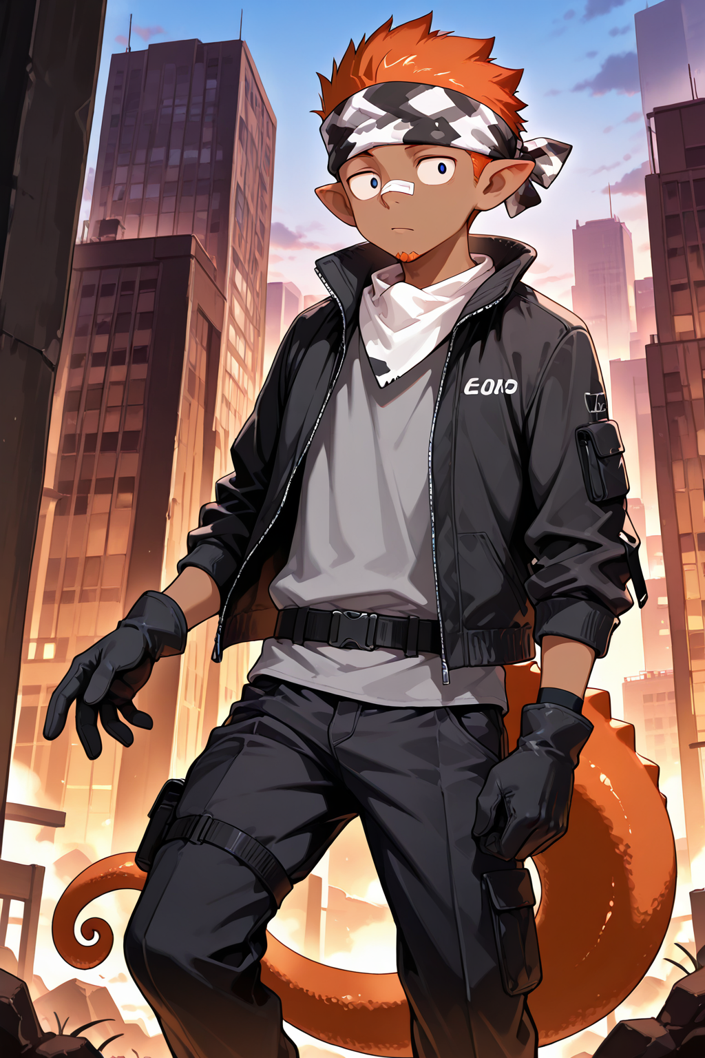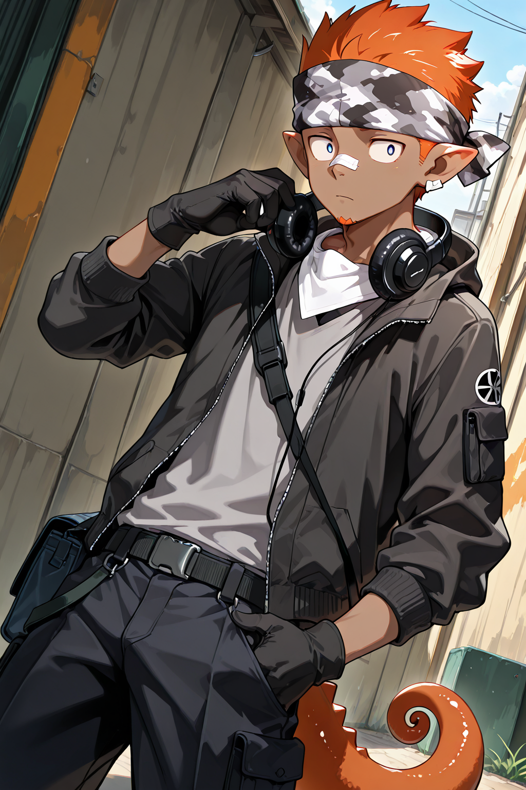 ethan, dark-skinned_male, orange_hair, white_eyes, chameleon_tail, orange_tail, skin1, bandaid, camouflage, goatee, black_gloves, grey shirt, bandana, black_jacket, black_pants, mask, pointy_ears, headphones, belt, bag