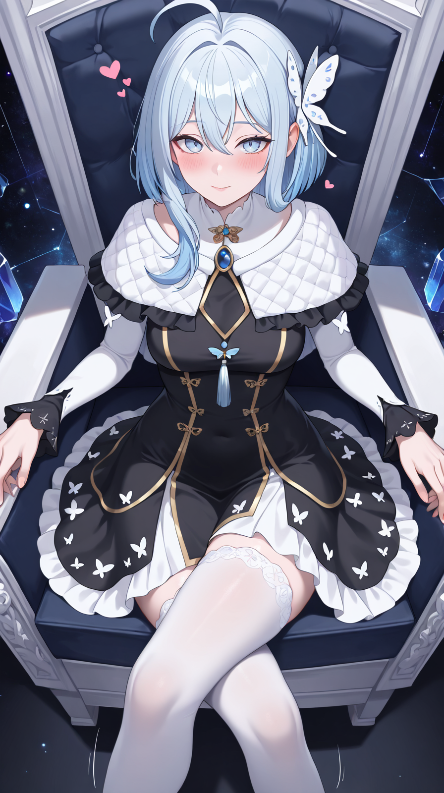 CielOutfit2, light blue hair, light blue eyes, medium hair, layered hair, side bangs, black dress, black frills, frilled capelet, long sleeves, frilled sleeves, gold trim, ahoge, layered dress, white underdress, butterfly motif, bow, ribbon, tassel, brooch, high collar, white stockings, butterfly hair ornament, white capelet, front panel,