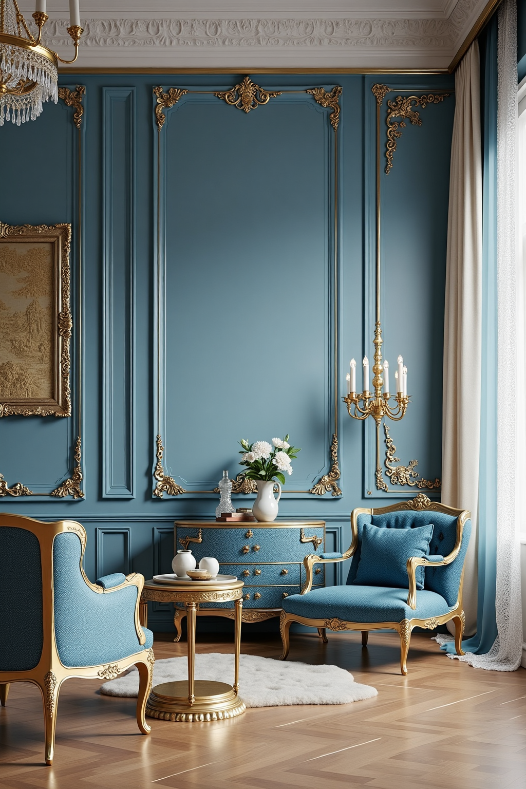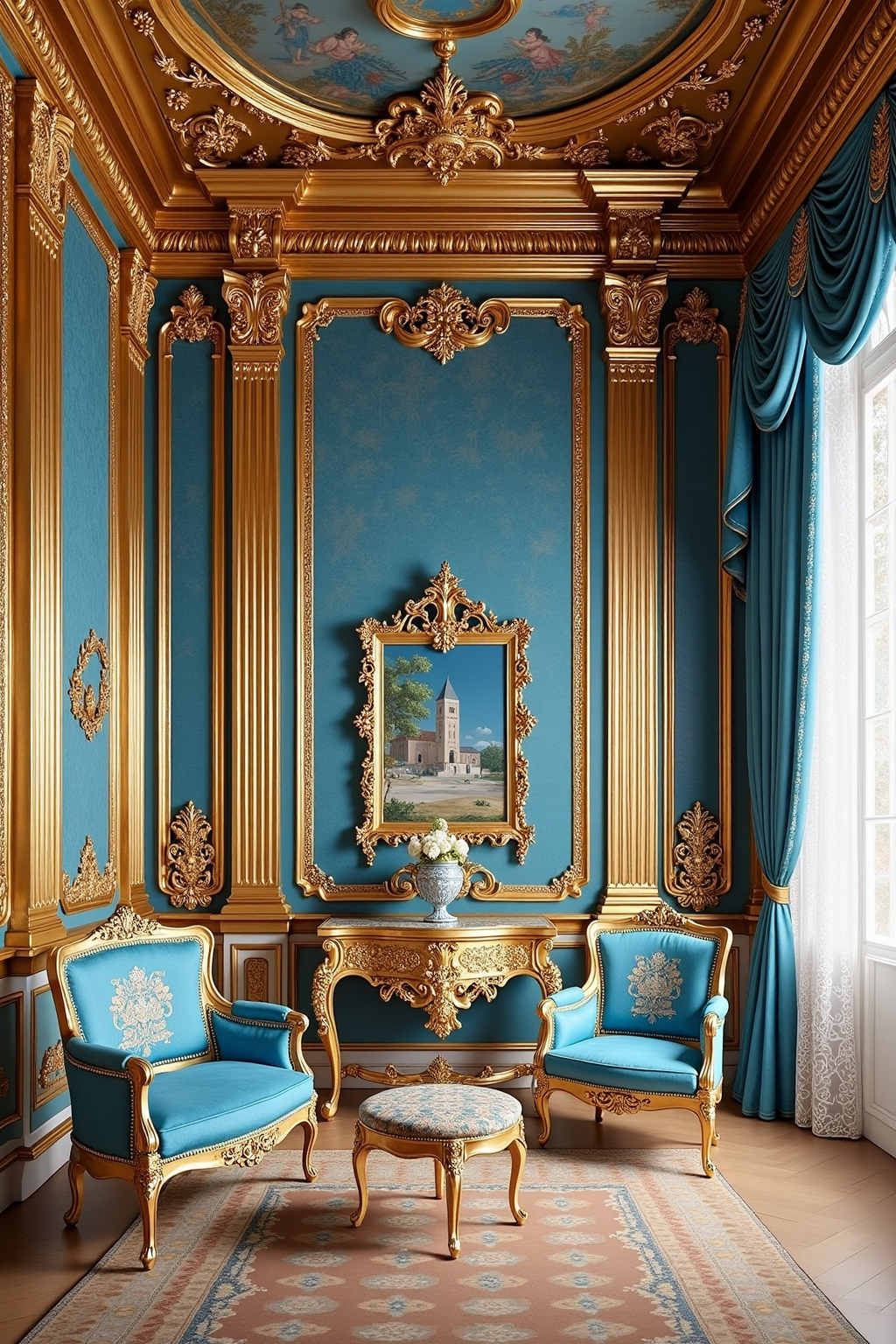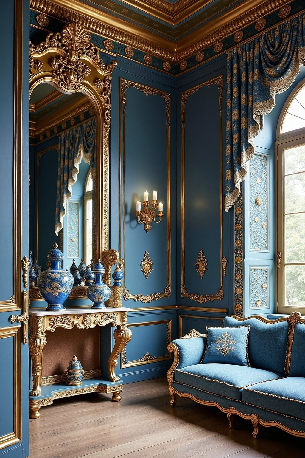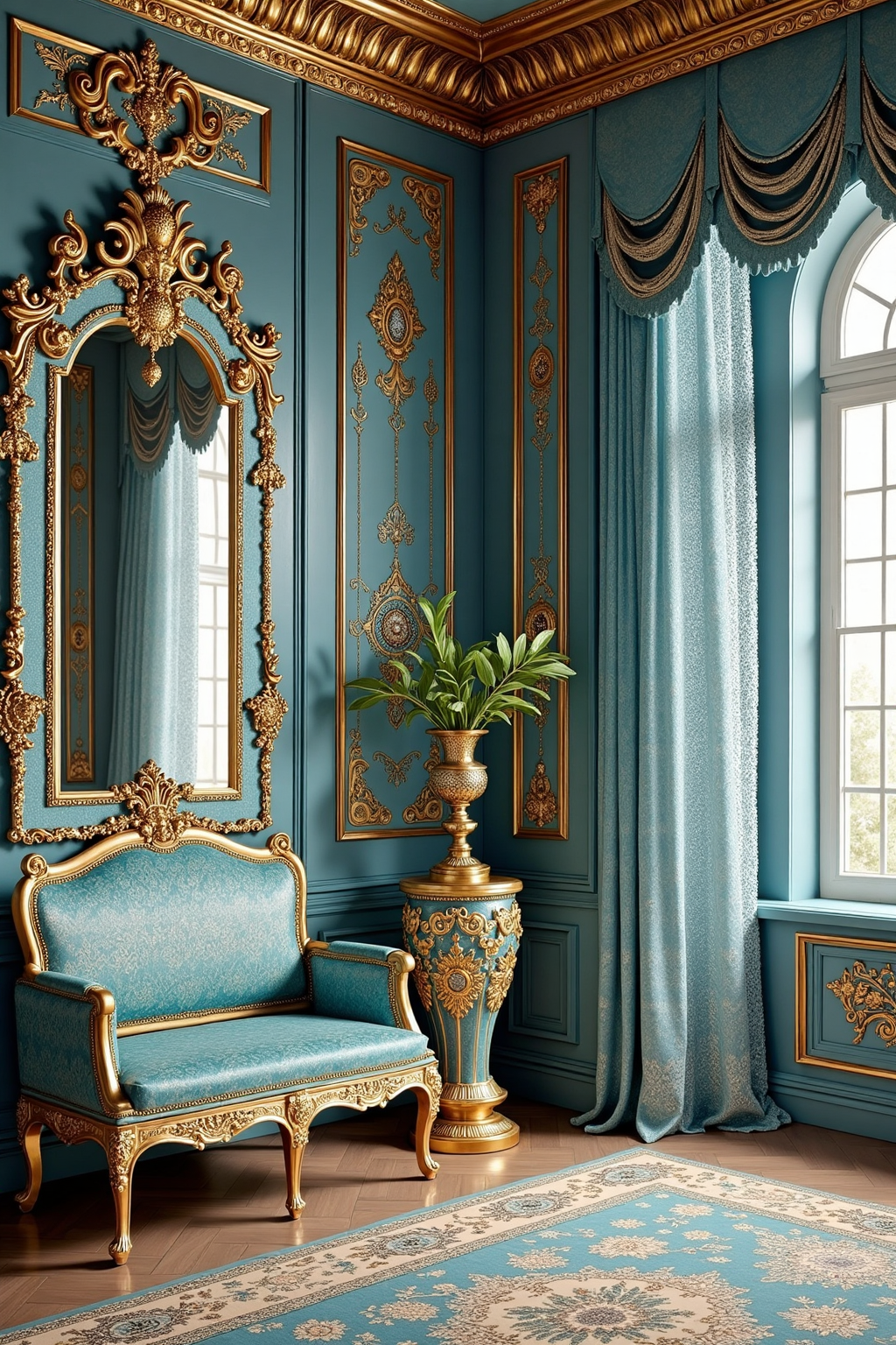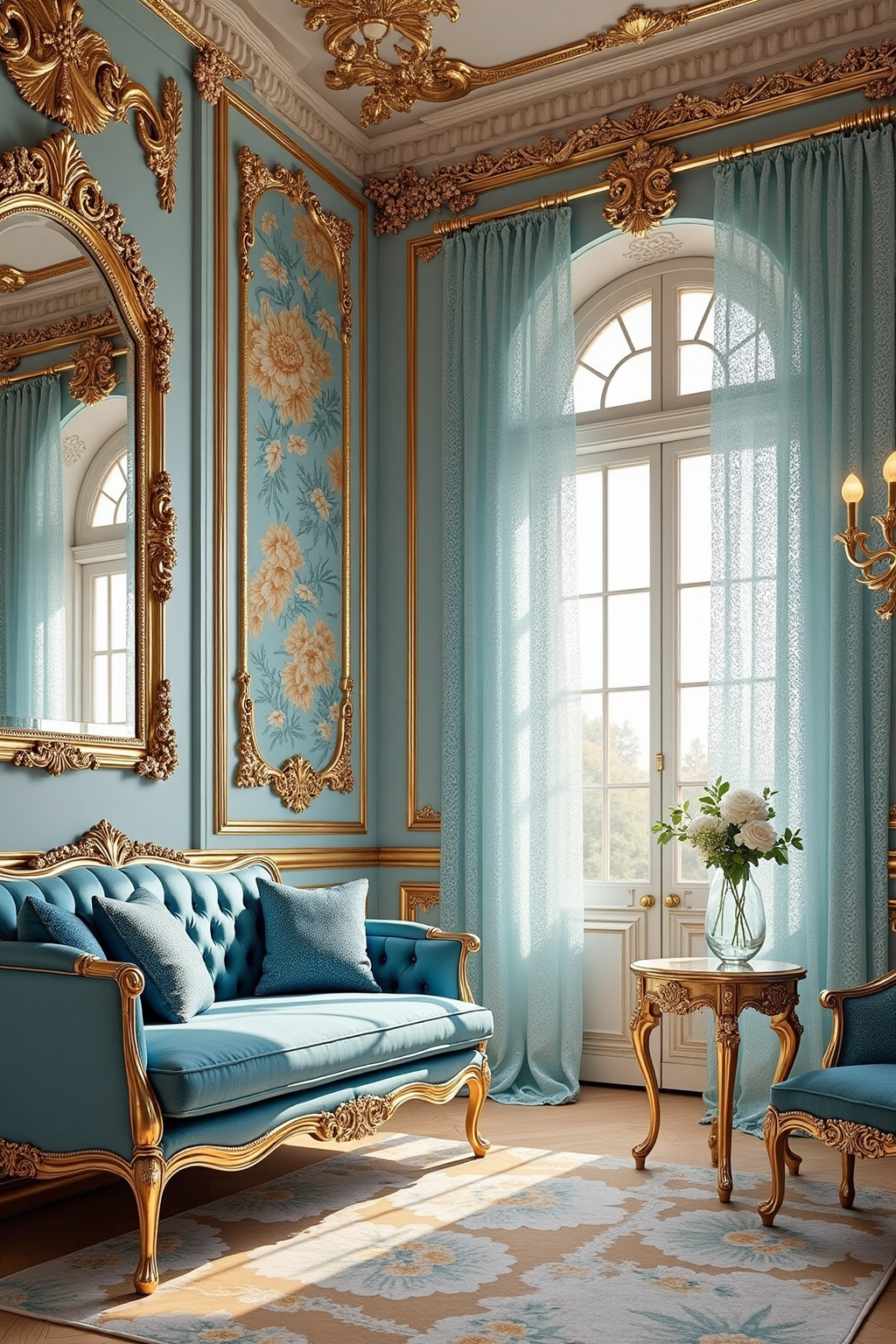 Blue and gold royal interior decoration, Rococo influence, delicate gold - leaf patterns, light blue lace curtains, gilded mirrors, plush blue velvet sofas.