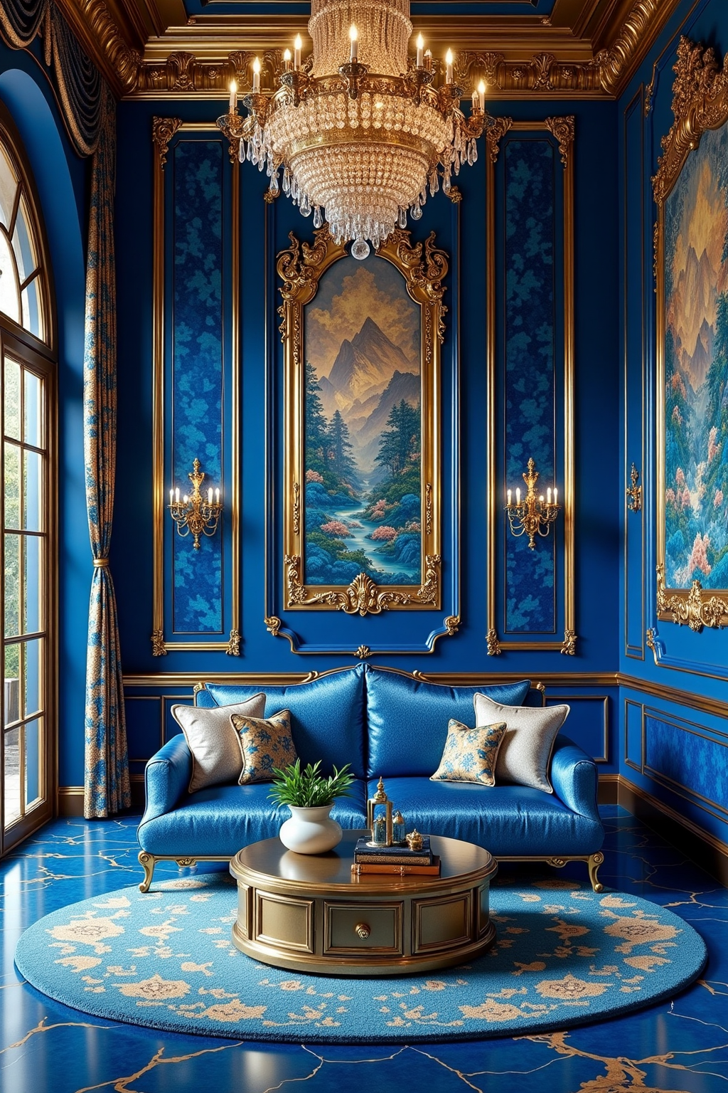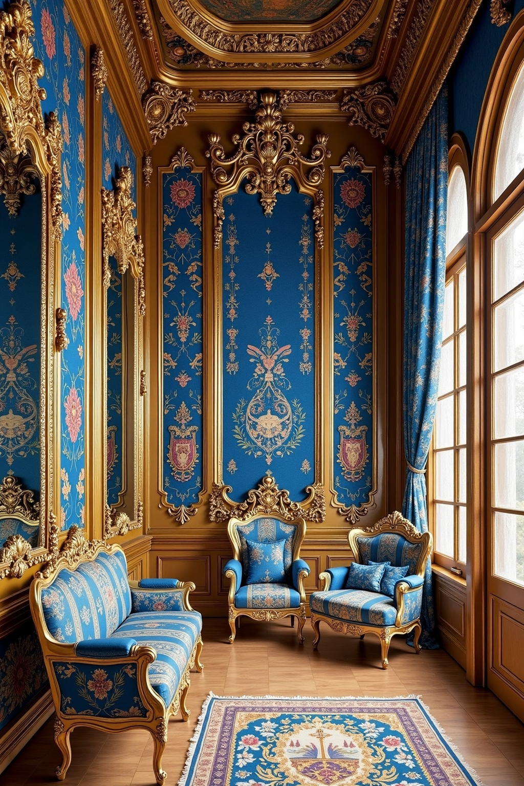 Blue and gold royal interior decoration, Baroque - style, elaborate gold carvings, large blue silk tapestries, crystal chandeliers, ornate furniture with pearl inlays.