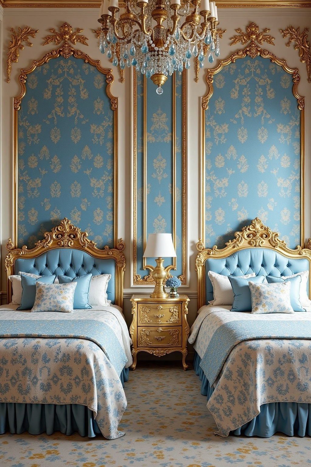 Blue and gold royal interior decoration, Victorian - inspired, gold - detailed wallpaper, sky - blue upholstered beds, carved golden bedside cabinets, chandelier with blue crystals.