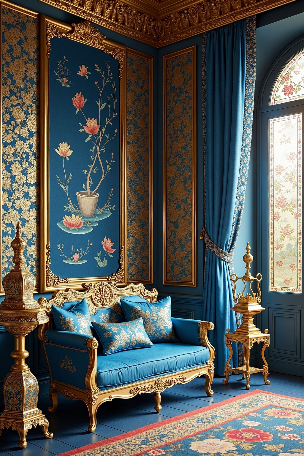 Blue and gold royal interior decoration, Asian - royal fusion, gold - etched screens, cerulean silk cushions, pagoda - shaped golden lanterns, hand - painted blue - gold murals.