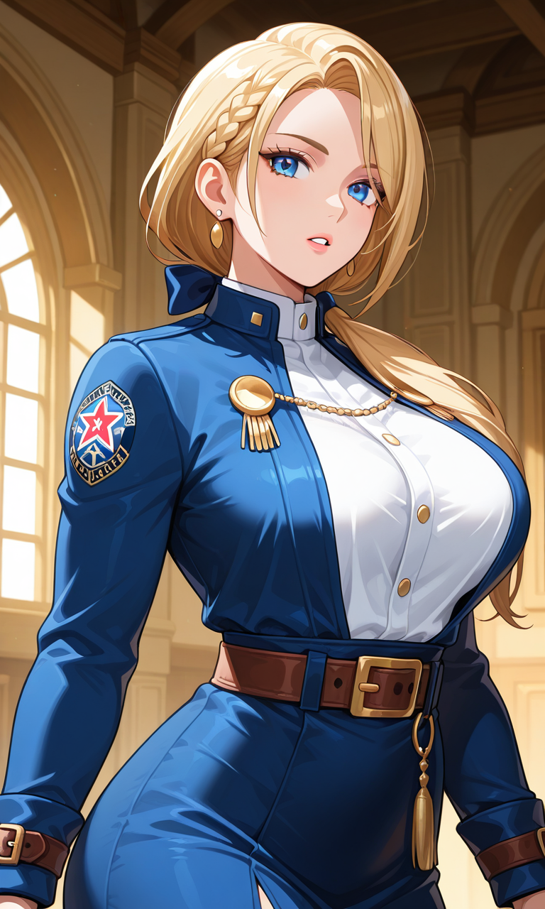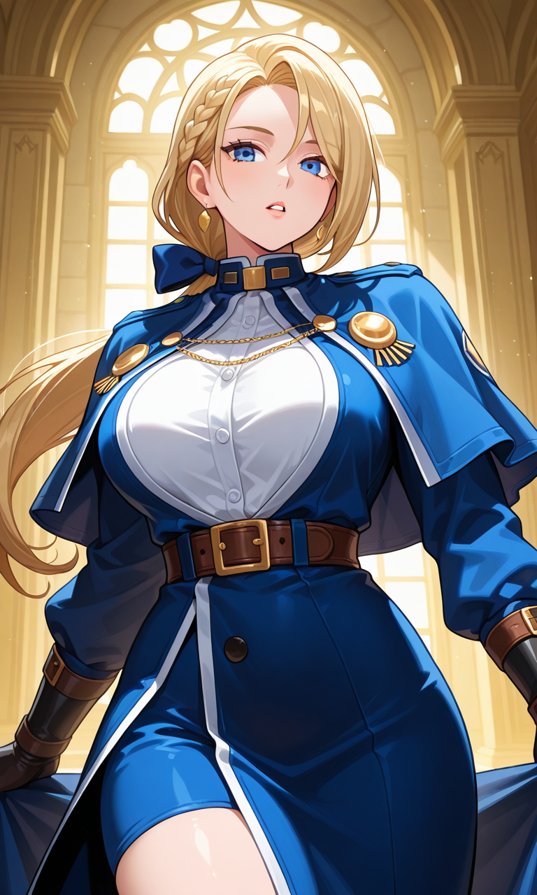 Lady Goenitz KofAllstar, 1girl, solo, long hair, breasts, blue eyes, large breasts, blonde hair, parted lips, ponytail, hair bow, low ponytail, braid hair, ribbon,