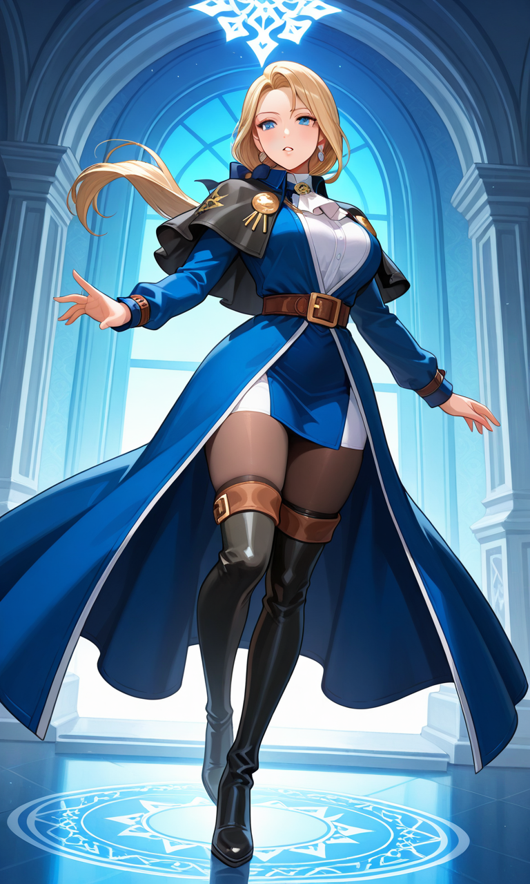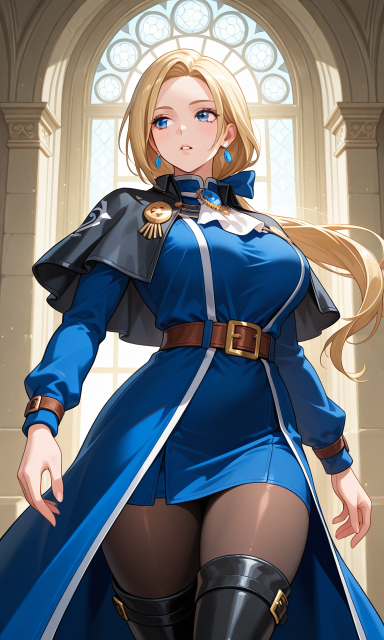 Long sleeves, dress, jewelry, earrings, belt, capelet, thighhighs, pantyhose, boots, thigh boots, blue coat, jacket, blue jacket, brown belt, bow ascot, black thighhighs, blue dress, long sleeves, ribbon, black footwear, coat, black capelet,