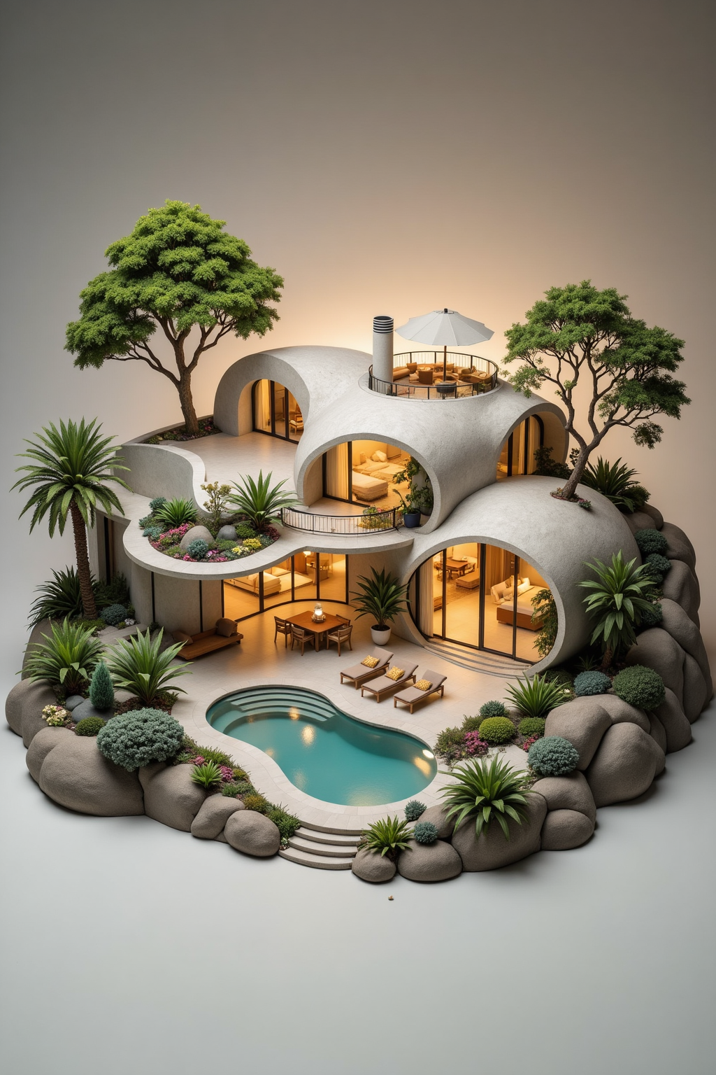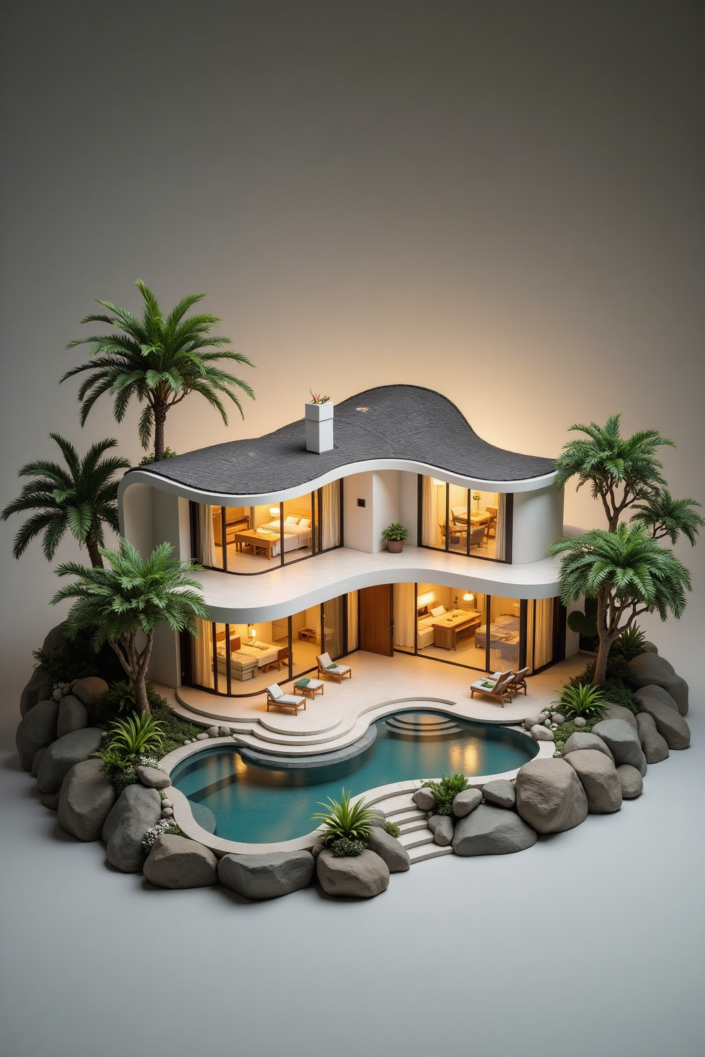 Miniature architectural models with landscaping, wavy - roof villa, natural - shaped pool, tropical plants, stone decorations, warm interior glow.