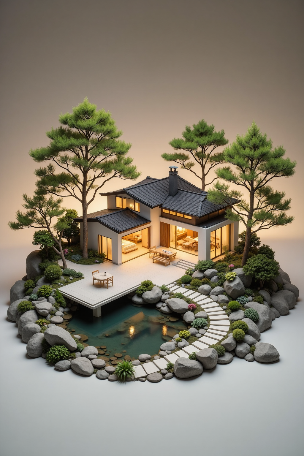 Miniature architectural models with landscaping, Asian - style house, small pond, tall trees, stepping stones, traditional - modern mix, warm lights.