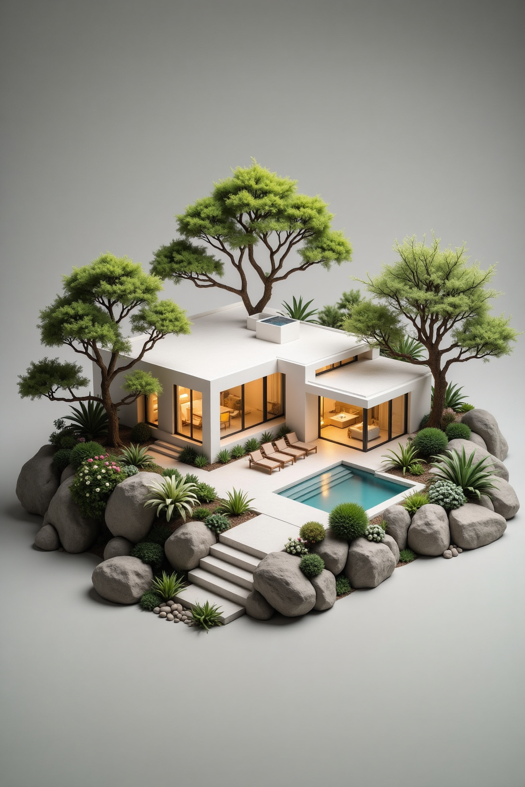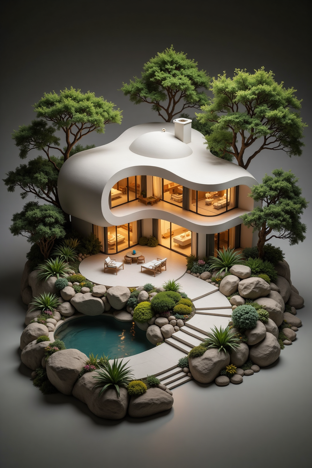 Miniature architectural models with landscaping, modern curved house, pool, bonsai - like trees, soft lighting, detailed greenery, smooth textures, compact scene.